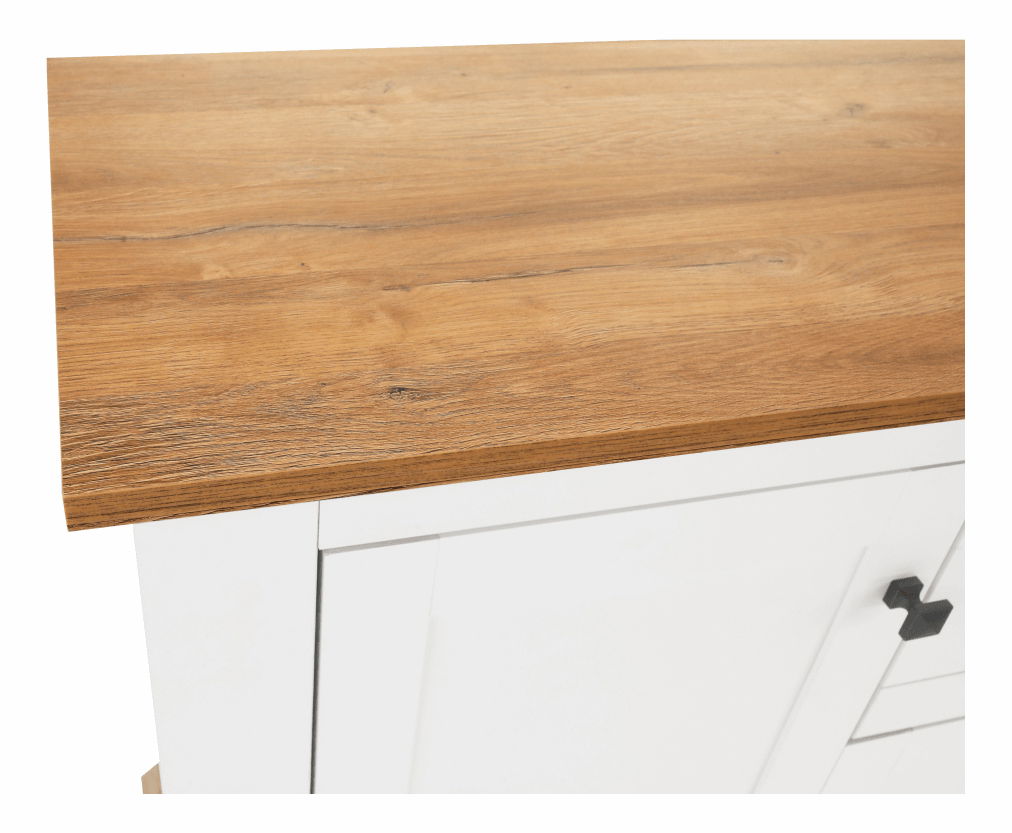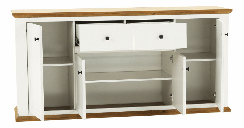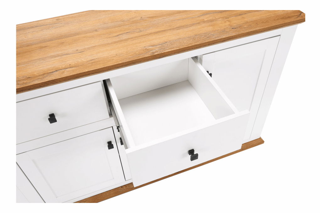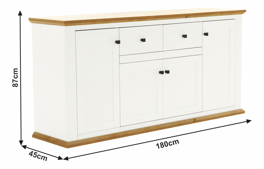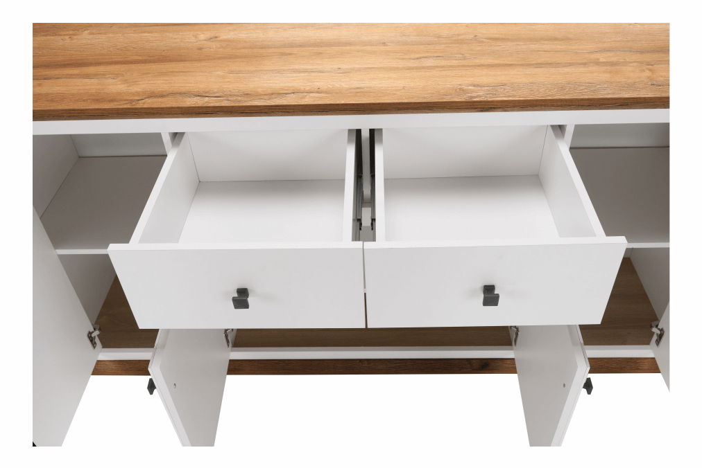 Komoda Leoras MZ9 je praktickým doplňkem do vašeho interiéru. S výškou 87 cm a hloubkou 45 cm má dostatek úložného prostoru pro vaše věci. Tato komoda v bílém a dub grand provedení je vyrobena z kvalitních materiálů jako DTD laminovaná deska a ABS hrany, které zajišťují její trvanlivost. Komoda má čtyři skříňky a dvě zásuvky pro ukládání oblečení nebo jiných věcí. S kovovými úchyty je otevírání skříněk a zásuvek snadné. Také má 3D efekt, který dodává prostoru zajímavý vzhled. Komoda Leoras MZ9 se dodává v demontu.