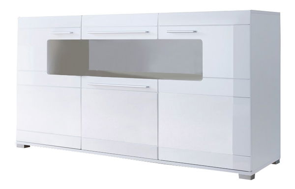 Nádherná trojdílná komoda dominantního luxusního charakteru se třemi dvířky a jednou zásuvkou uprostřed v horní části. Stavební materiál je odolná DTD laminovaná, barevné provedení je bílý extra vysoký lesk HG. Uprostřed komody se nachází otevřená police, komoda stojí na šedých drobných nožkách a má tenké dlouhé vodorovné úchyty.