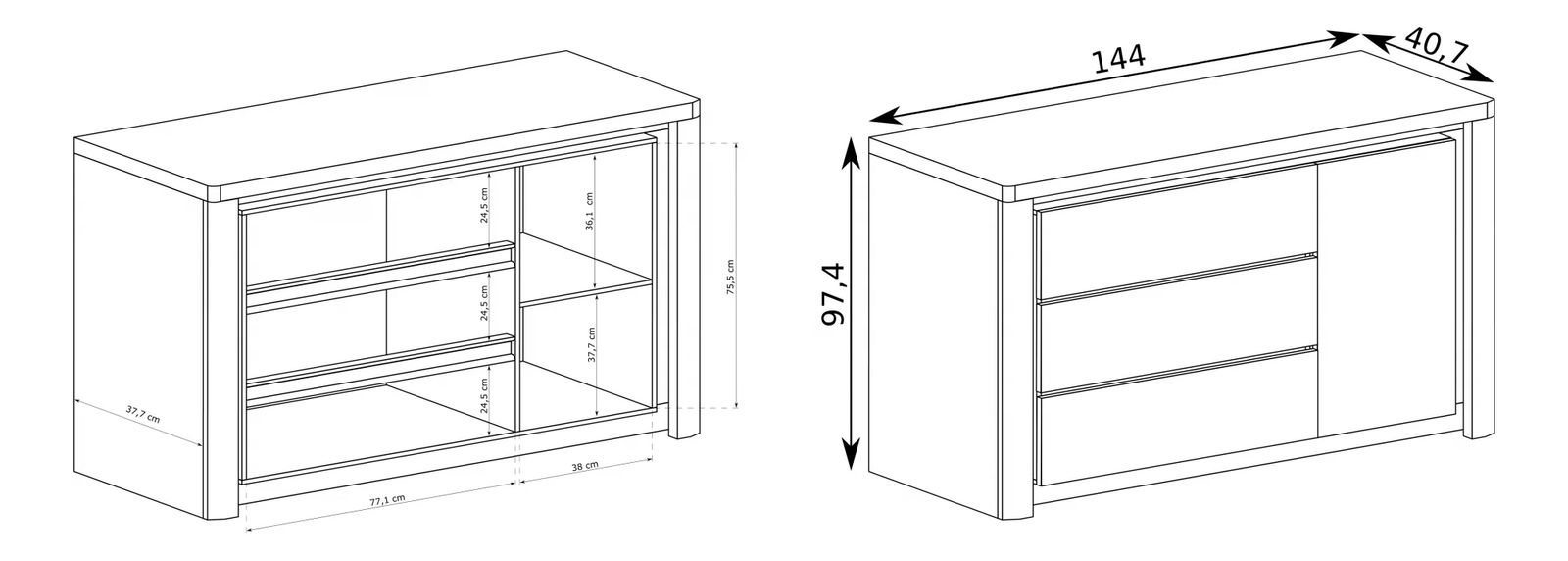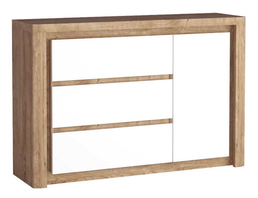 Elegantní a nadčasová komoda. Díky třem prostorným zásuvkám a skříňce se stává velmi funkčním nábytkem. Dostupná v barvě dub ribbeck v kombinaci s bílými lesklými předními částmi. Nábytek využívá nejkvalitnější panty s tichým zavíráním. Komoda vhodná do ložnice, pokoje a obývacího pokoje. Prosvětlí interiér a dodá mu moderní vzhled.