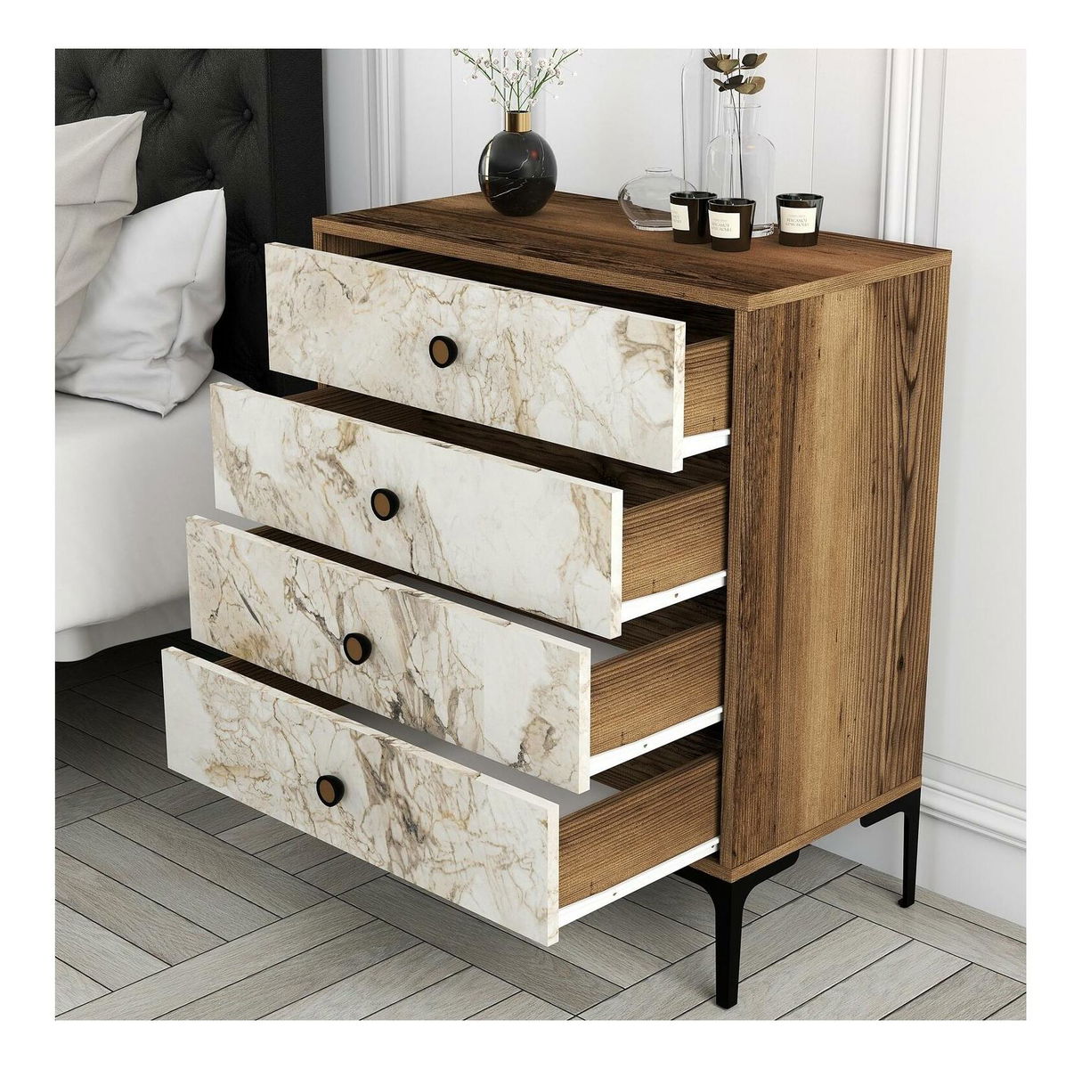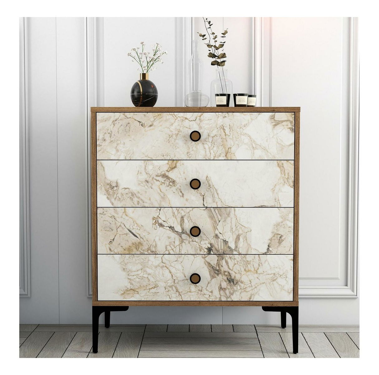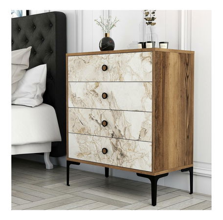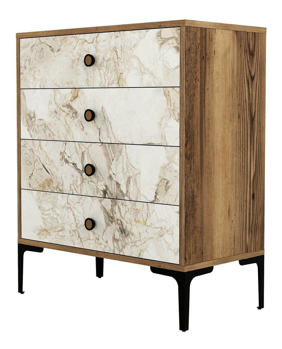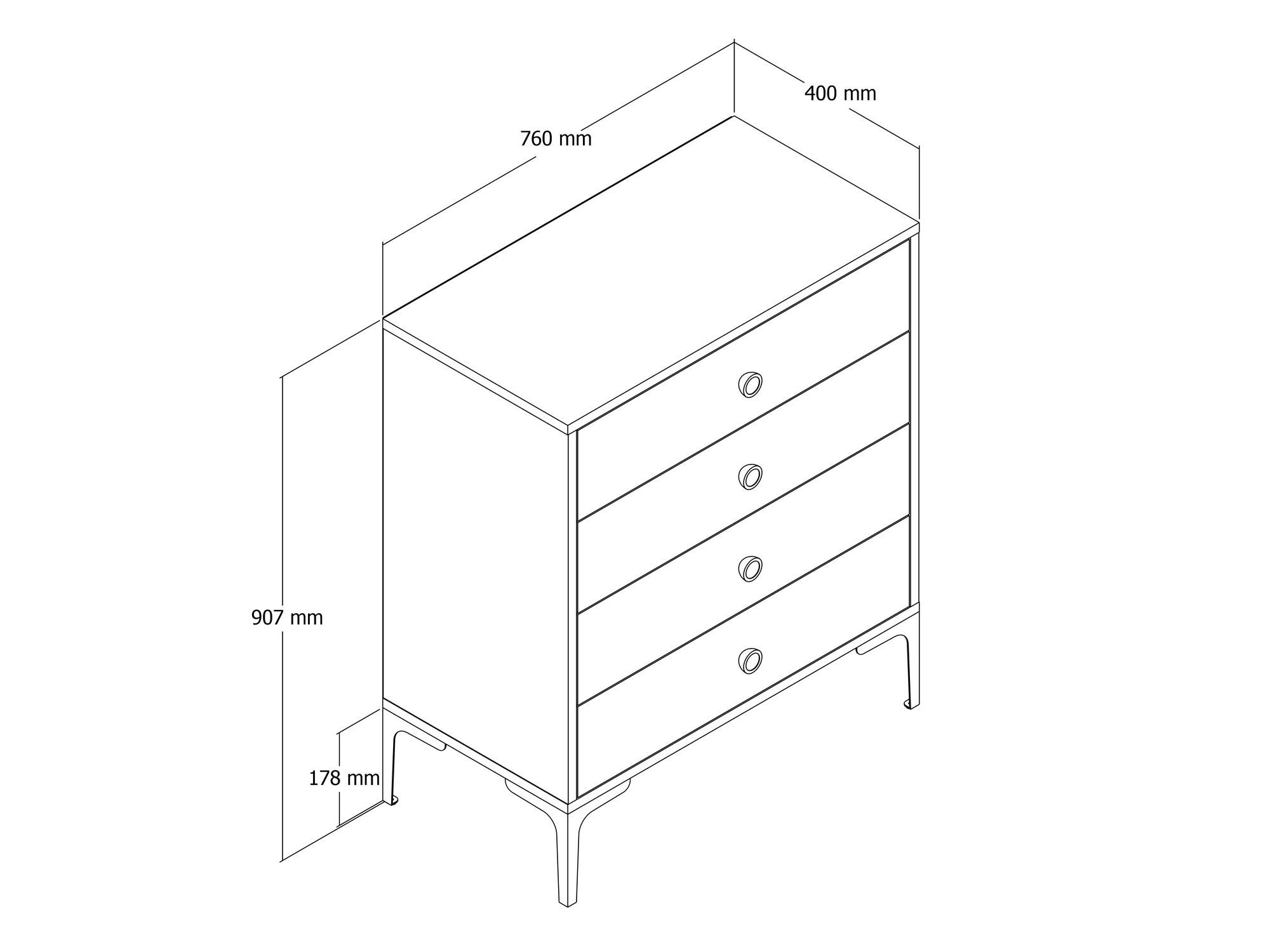 tloušťka: 18 mm, plastová rukojeť kovové nohy, komoda velikost: šířka: 76 cm, výška: 90,7 cm, hloubka: 40 cm, 4 zásuvky výška nohy: 17,8 cm