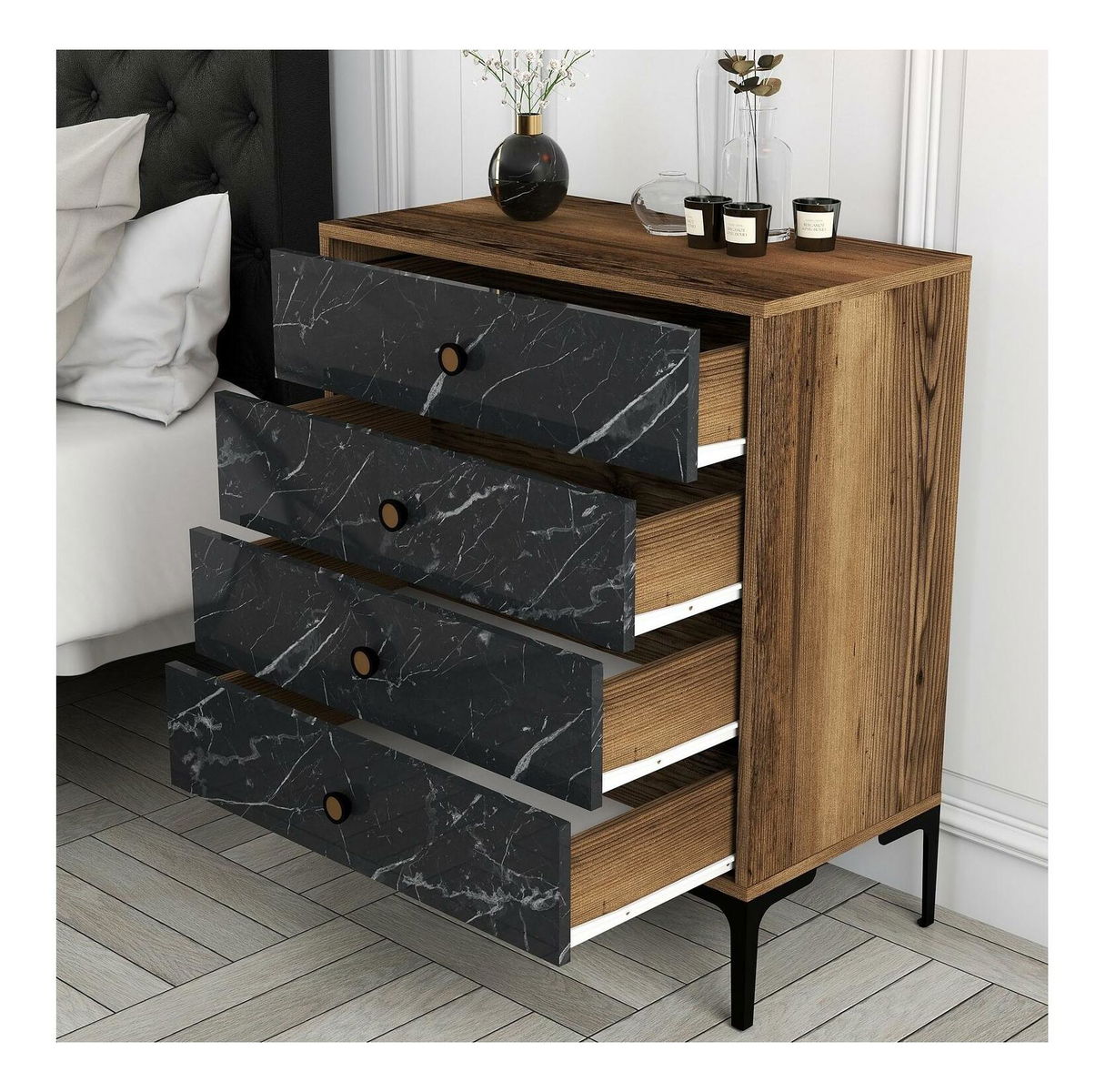 tloušťka: 18 mm, plastová rukojeť kovové nohy, komoda velikost: šířka: 76 cm, výška: 90,7 cm, hloubka: 40 cm, 4 zásuvky výška nohy: 17,8 cm