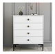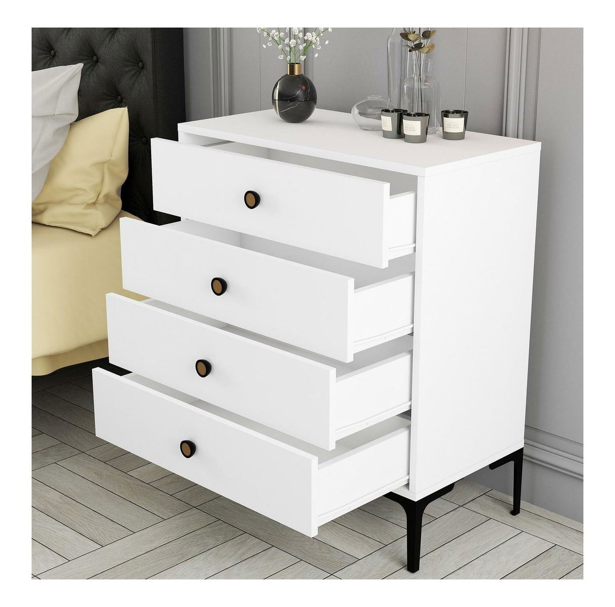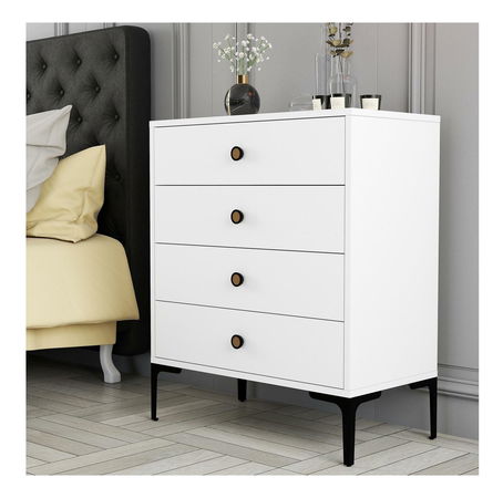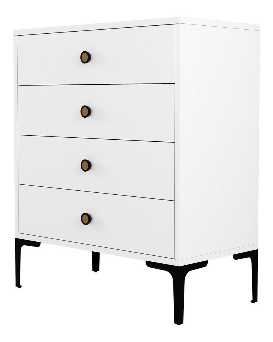 tloušťka: 18 mm, plastová rukojeť kovové nohy, komoda velikost: šířka: 76 cm, výška: 90,7 cm, hloubka: 40 cm, 4 zásuvky výška nohy: 17,8 cm