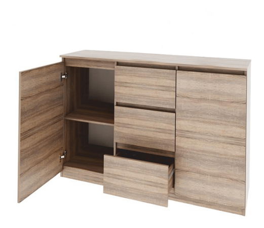 ZobrazitTrendová komoda, která se může umístit skoro v každé místnosti. Vybavena je 3 dvířky, bezúchytové systémem otevírání a třemi zásuvkami umístěnými nad sebou uprostřed. Materiál je DTD laminovaná, provedení dub sonoma.