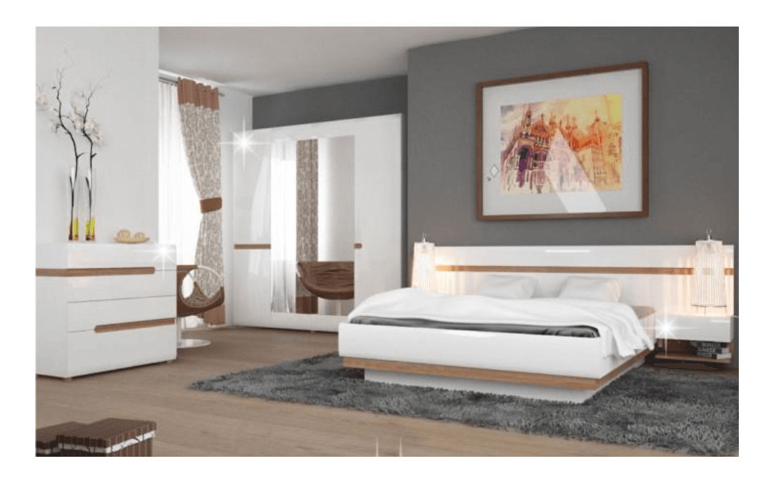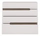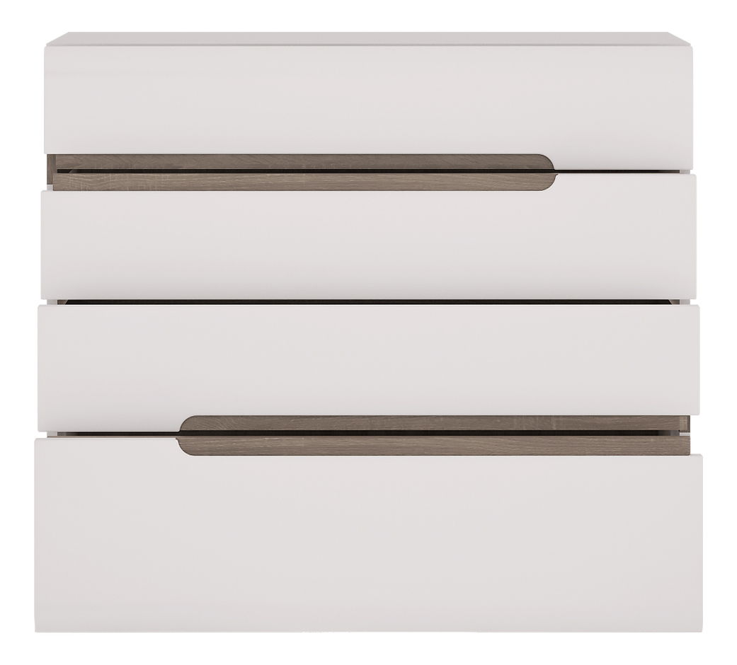 Přitažlivá designová komoda se 4 zásuvkami v odstínu lesklé bílé doplněna o designový prvek dvou rovnoběžných pásů v odstínu dub sonoma truflový, ktere se nacházejí mezi první a druhou a třetí a čtvrtou zásuvkou.