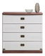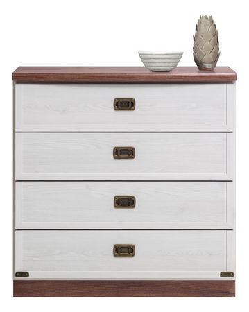 Klasická 4-zásuvková komoda. Zajímavé úchyty na dvířkách a spodní části v provedení mosaz.
