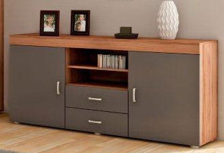 Moderní komoda se dvěma zásuvkami, dvěma dvířky za kterými se nachází polička a praktickým otevřeným odkládacím prostorem.