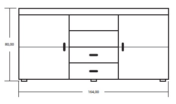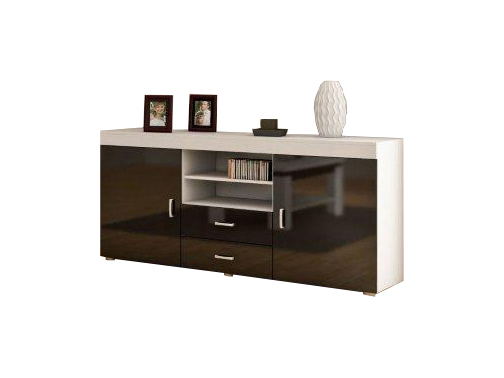 Moderní komoda se dvěma zásuvkami, dvěma dvířky za kterými se nachází polička a praktickým otevřeným odkládacím prostorem.