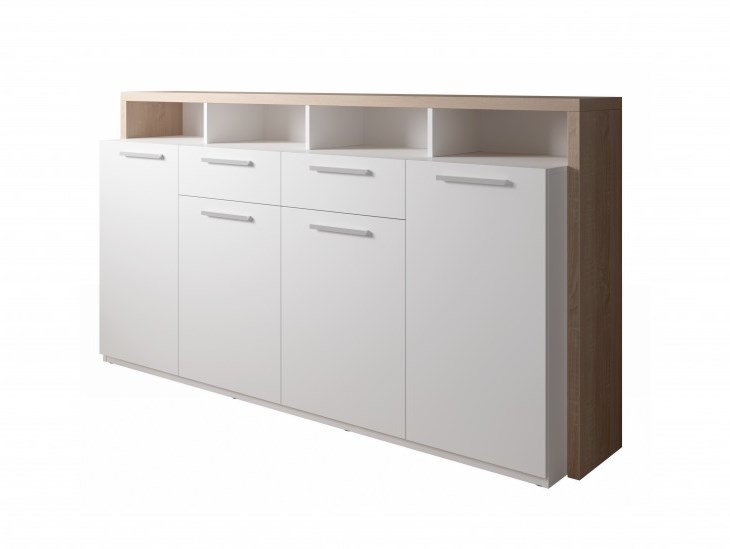 Potřebujete zvětšit úložný prostor v domácnosti? Komoda Mason poskytuje dostatek úložného prostoru v podobě dvířek, dvou šuplíků a čtyř otvorů. Komoda má matnou povrchovou úpravu. Nábytek je vyroben z dřevotřískové desky.