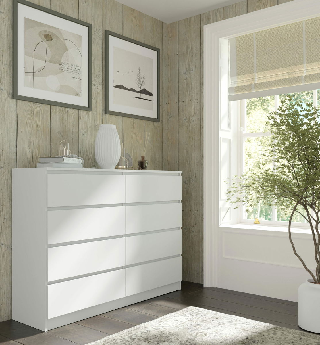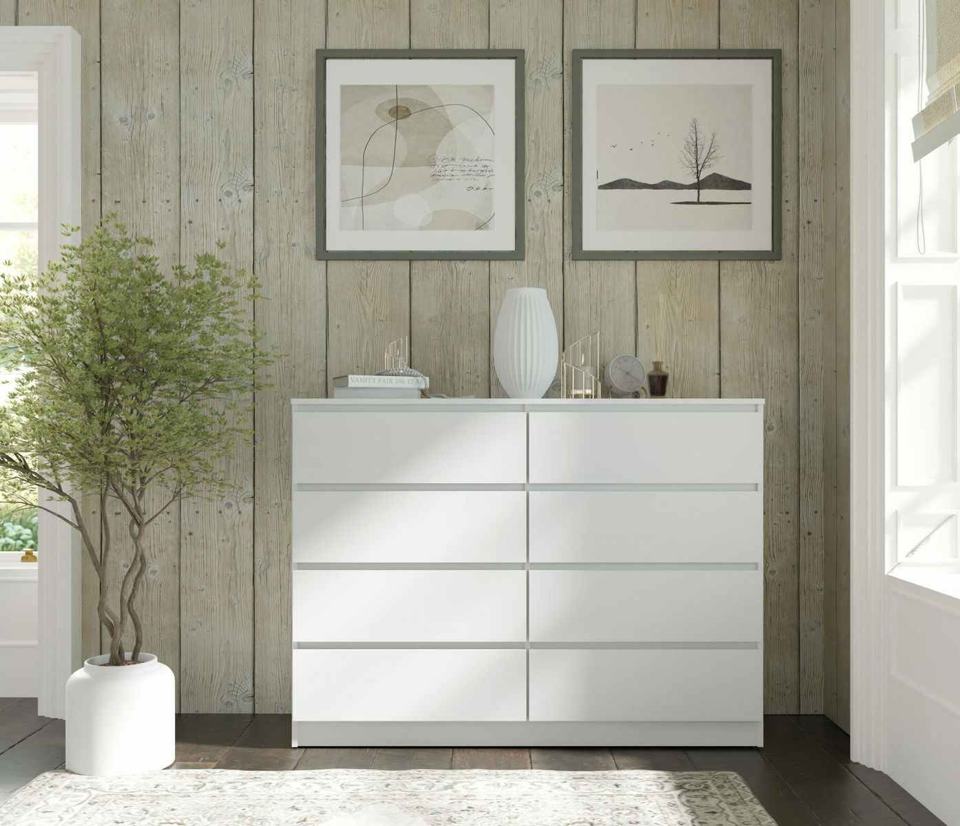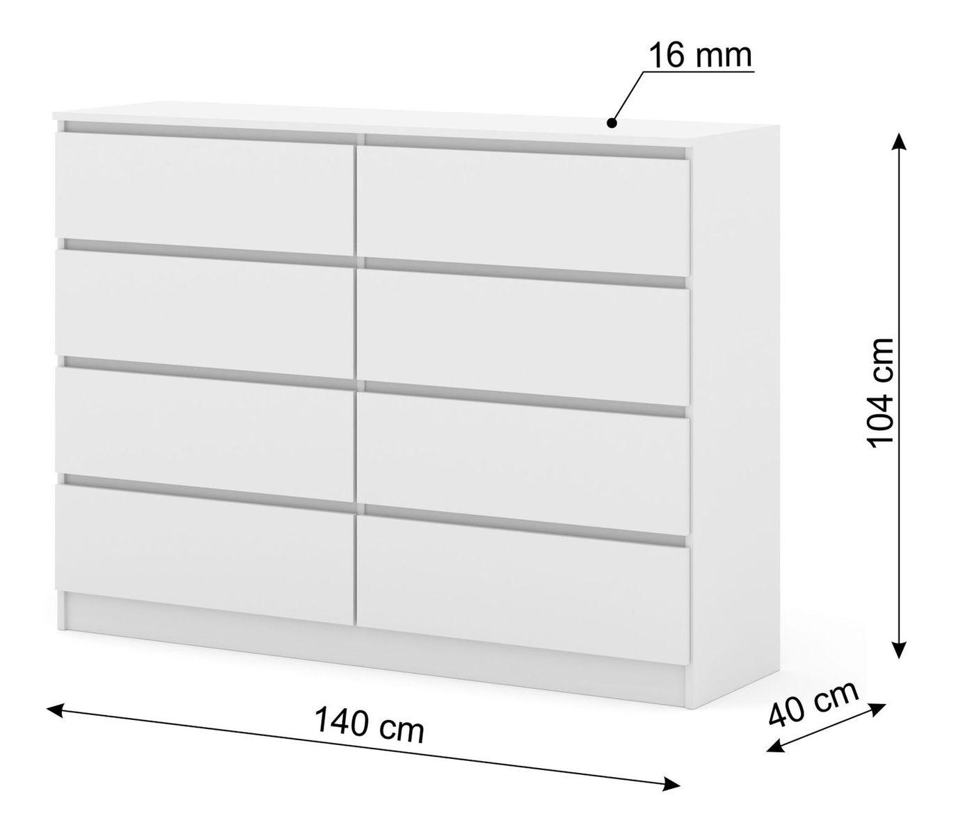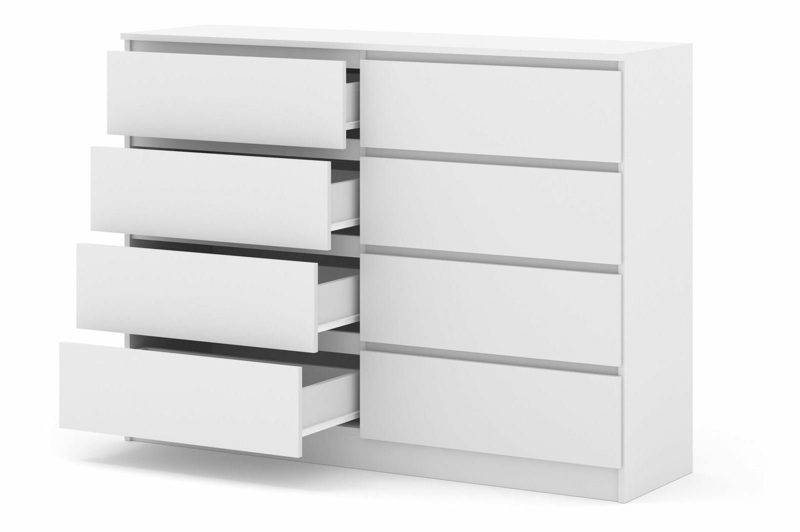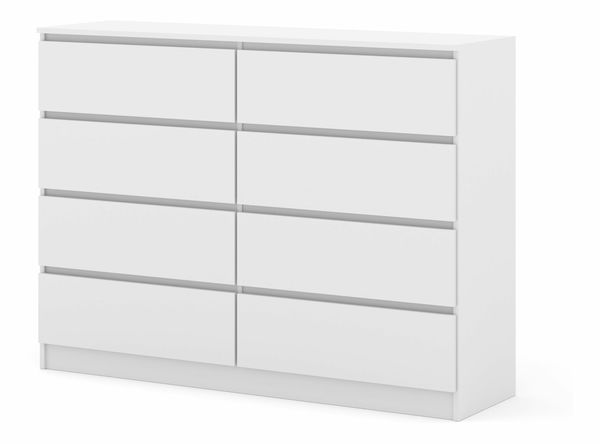 Jednoduchá osmizásuvková komoda vhodná nejen do ložnice, ale také na chodbu. Svým vzhledem zapadne do každé domácnosti. Pojme všechny věci, které potřebujete uložit nebo skrýt před návštěvou.