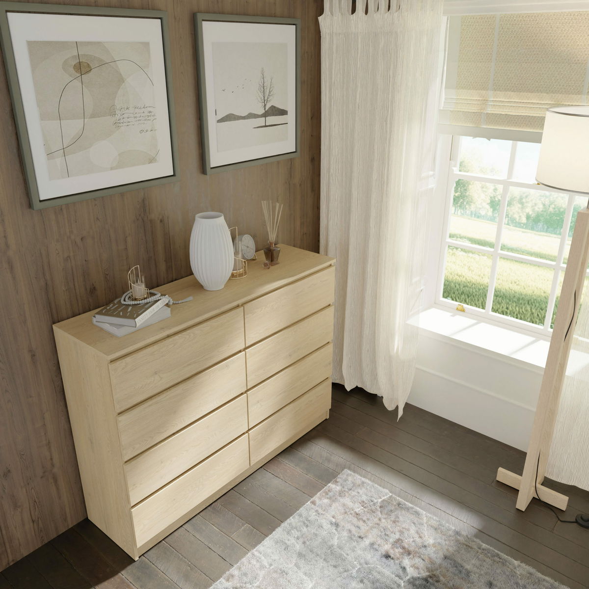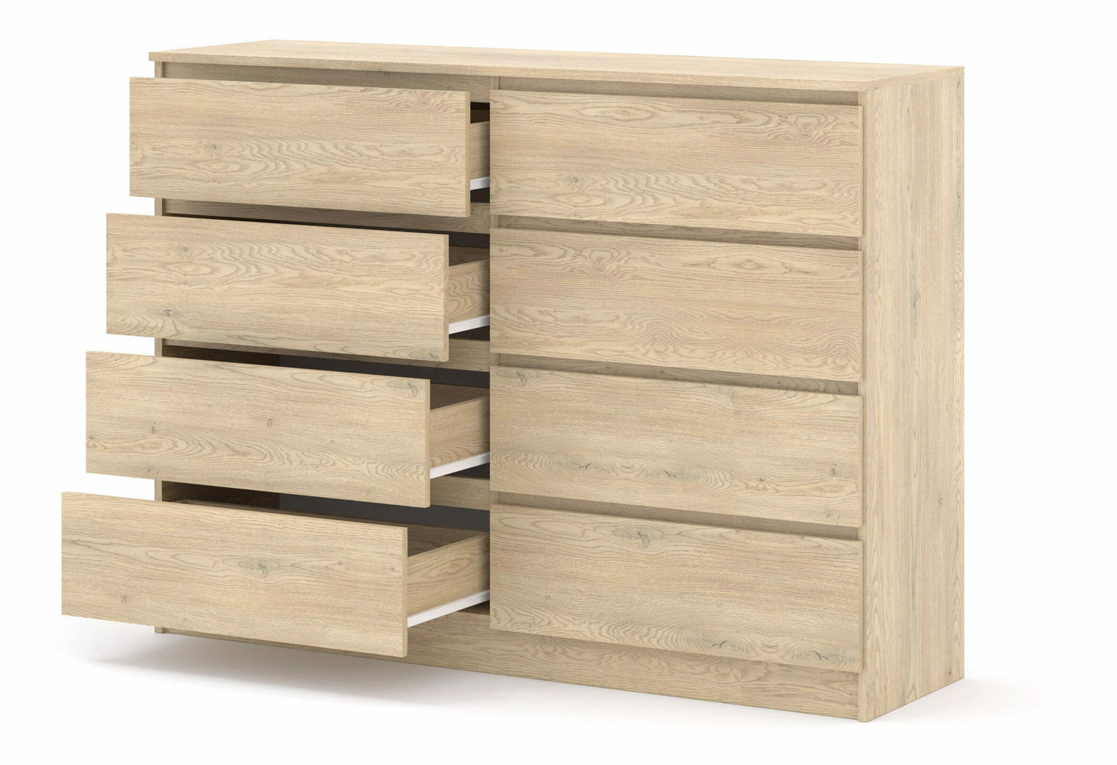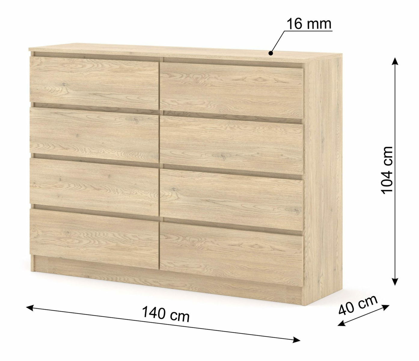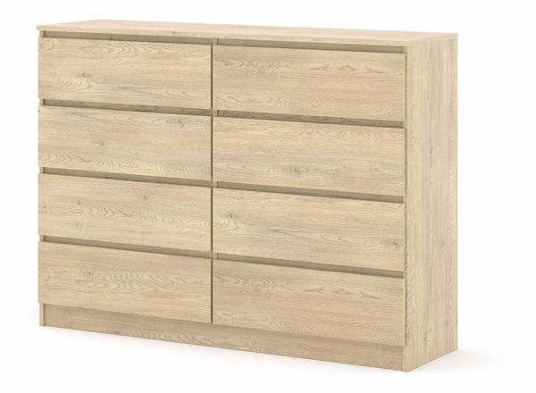 Jednoduchá osmizásuvková komoda vhodná nejen do ložnice, ale také na chodbu. Svým vzhledem zapadne do každé domácnosti. Pojme všechny věci, které potřebujete uložit nebo skrýt před návštěvou.
