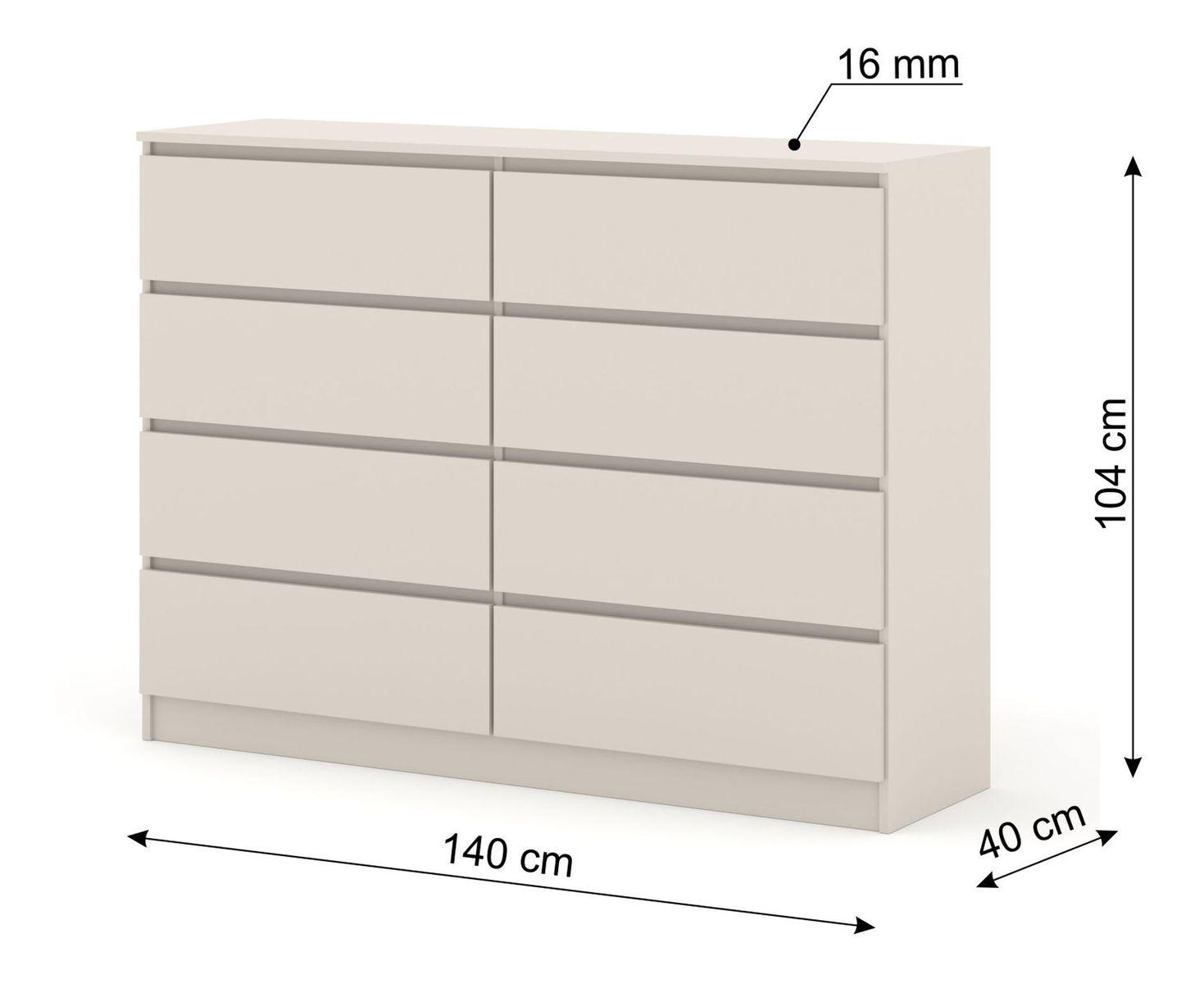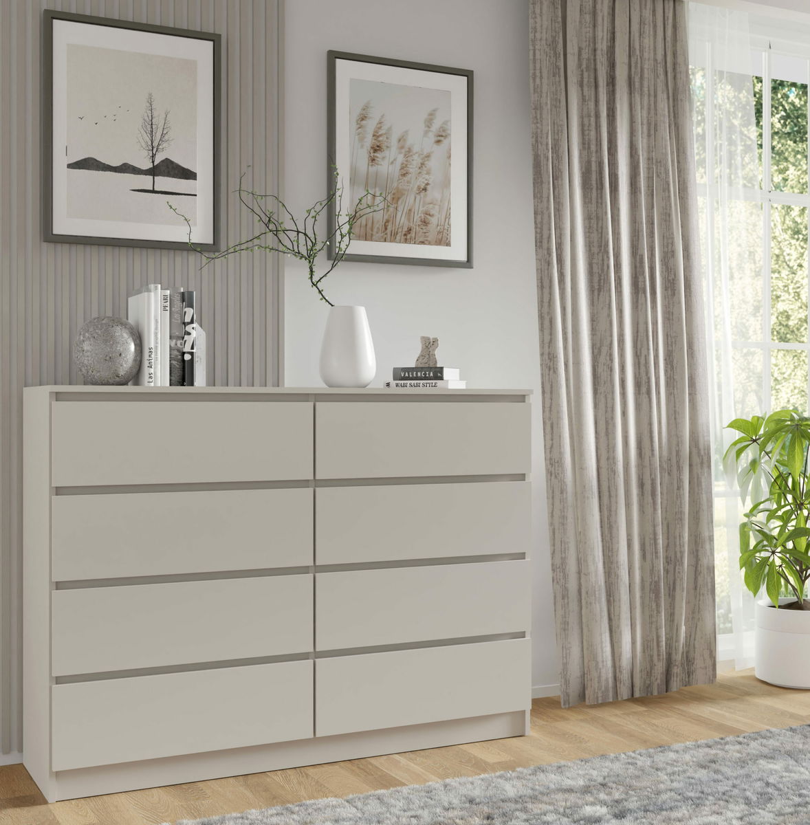 ZobrazitJednoduchá osmizásuvková komoda vhodná nejen do ložnice, ale také na chodbu. Svým vzhledem zapadne do každé domácnosti. Pojme všechny věci, které potřebujete uložit nebo skrýt před návštěvou.