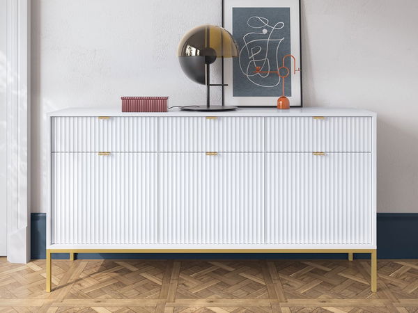 Široká komoda Mijeno Gold MKSZ154 zaujme svojí elegancí a funkčností. Dodejte svému obývacímu pokoji nádech luxusu. Moderní komoda se vyznačuje bohatým dekorem. Zlaté úchyty a nohy komody jsou jemným dotekem luxusu, který zaujme svou jemností. Fenomenálně kontrastuje s ostatními prvky, což jí dodává jedinečný lesk. Velmi působivá jsou i frézovaná čela, která dodávají komodě jedinečný styl. Komoda se bude perfektně hodit na šperky nebo sklenice. Nebo jste snad milovníkem hodinek a máte rozsáhlou sbírku? Využijte na ně jeden z výsuvných boxů! Stylová komoda má také tři prostorné skříňky se šesti policemi! Kousek nábytku, který plní své praktické funkce a zároveň poskytuje lehkou a elegantní dekoraci.