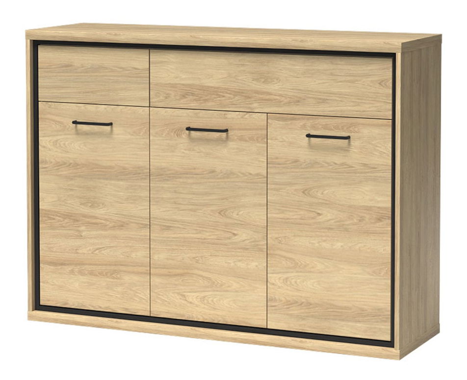 ZobrazitVelká světlá komoda v přírodní hikorové barvě. Skládá se ze dvou zásuvek, jedné větší a jedné menší na pravé straně. Pod zásuvkami máme úložný prostor v podobě dvou a jednodveřové skříně. V každém z nich je police z laminované desky, díky které si můžeme organizovat věci. Komoda si najde své místo v obýváku, ložnici i jakékoli jiné místnosti, je univerzální díky svému rozdělení na šatní skříň a zásuvky. Černé doplňky ladí s dekorem ve stylu podkroví. Komoda bude dokonalým doplňkem do pokoje pro mladé. Každý teenager si bude moci pohřbít své poklady. Jako doplňkovou možnost můžeme použít efektní podsvícení LED stolová deska, černé nohy nebo dekorační dubová deska na čelech zásuvek.