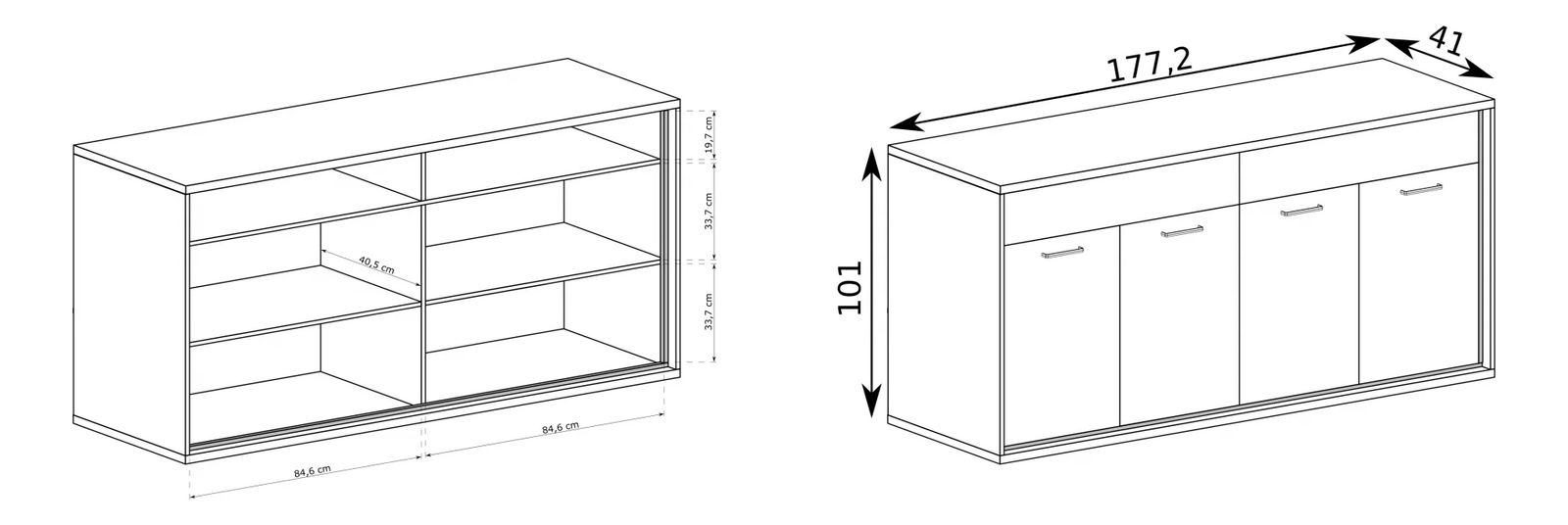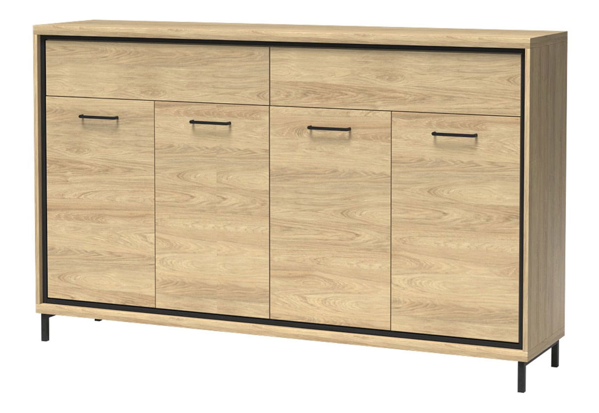 Velká komoda o šířce až 177 cm. Spodní část tvoří dvě skříňky s dvoukřídlými dveřmi. Každá má odkládací polici. Komoda má dvě zásuvky otevírané na dotek, které se vysouvají na kuličkových vodítkách. Panty použité ve dveřích jsou nejkvalitnější panty s tichým zavíráním. Černé úchytky a ozdobná lišta kolem nábytku vytváří zajímavou kombinaci se světlou nábytkovou deskou. Barva nejblíže přirozené barvě dřeva. Komoda se hodí do ložnice, obývacího pokoje či mládežnického pokoje, je univerzální a velmi prostorná. Moderní, industriální styl. Můžeme jej využít i jako šatní skříň, v jídelně k uchycení talířů, krásné vázy nebo vánočních ozdob.