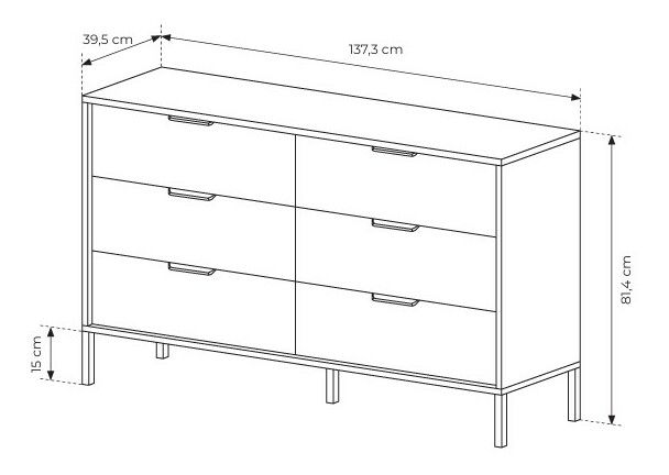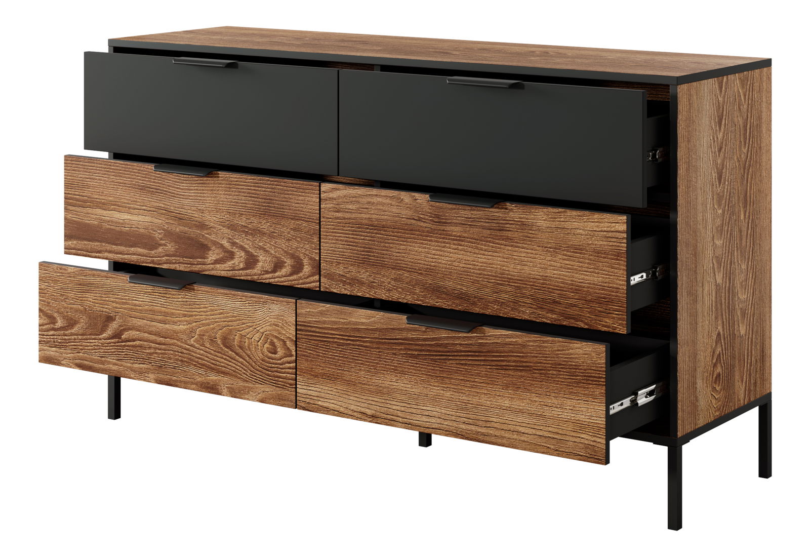 ZobrazitTato komoda představuje praktické a stylové řešení úložného prostoru pro váš interiér. Korpus i přední plochy jsou vyrobeny z laminované dřevotřísky E05, přičemž čelní plochy jsou doplněny o 18 mm MDF desku, která přidává na pevnosti a sofistikovaném vzhledu. Zadní deska v dekoru dub craft zlatý vnáší do nábytku teplý přírodní akcent. Komoda disponuje šesti šuplíky na kuličkových ložiskách s plným výsuvem, které umožňují pohodlný přístup k uloženým věcem. Všechny zásuvky jsou vybaveny systémem tichého zavírání, což zajišťuje komfort při každodenním používání a zároveň chrání materiál před opotřebením. Černé kovové úchyty a nohy dodávají komodě moderní charakter a eleganci, která skvěle zapadne do současných interiérů. Díky svému designu je univerzálním kusem nábytku vhodným do obývacího pokoje, ložnice či pracovny, kde kombinuje funkčnost s nadčasovou estetikou.