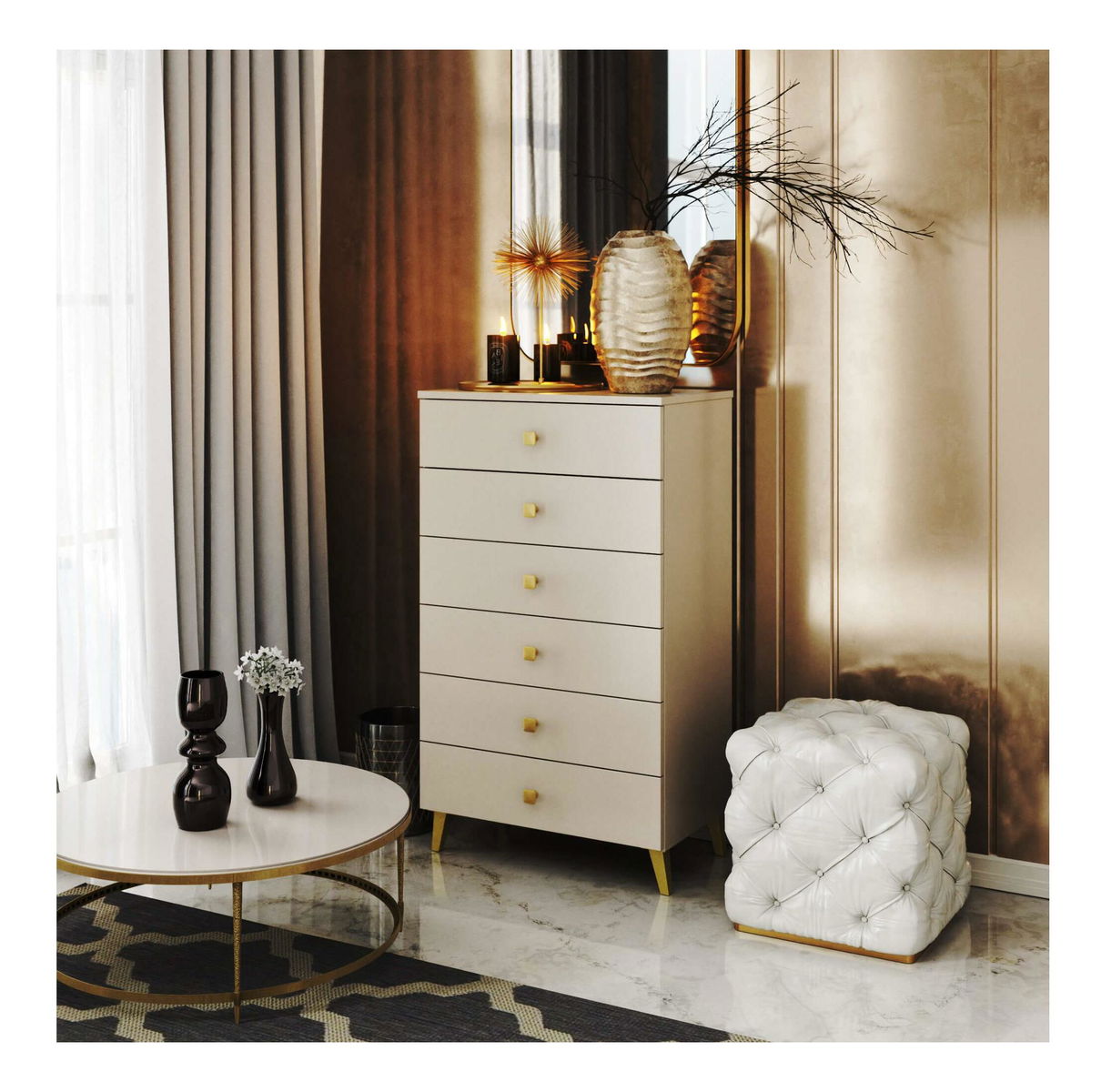 ZobrazitKomoda Mobian 6 je elegantní a funkční kus nábytku ideální pro moderní interiéry. Vyrobeno z kvalitní laminované ABS desky, je navrženo na dlouhou životnost. Zlaté nožičky a úchyty dodávají komodě luxusní vzhled, který upoutá pozornost. Disponuje čtyřmi prostornými zásuvkami o rozměrech 51,5 cm na šířku a 35 cm na hloubku, což poskytuje dostatek úložného prostoru. Zásuvky jsou zamykatelné, čímž zajišťují bezpečnost uložených předmětů. Komoda je balena v kompaktních balících o rozměrech 7 x 46,5 x 10,5 cm / 25,6 kg a 68,5 x 38,5 x 5,5 cm / 6,4 kg, což umožňuje snadné přenášení a montáž.