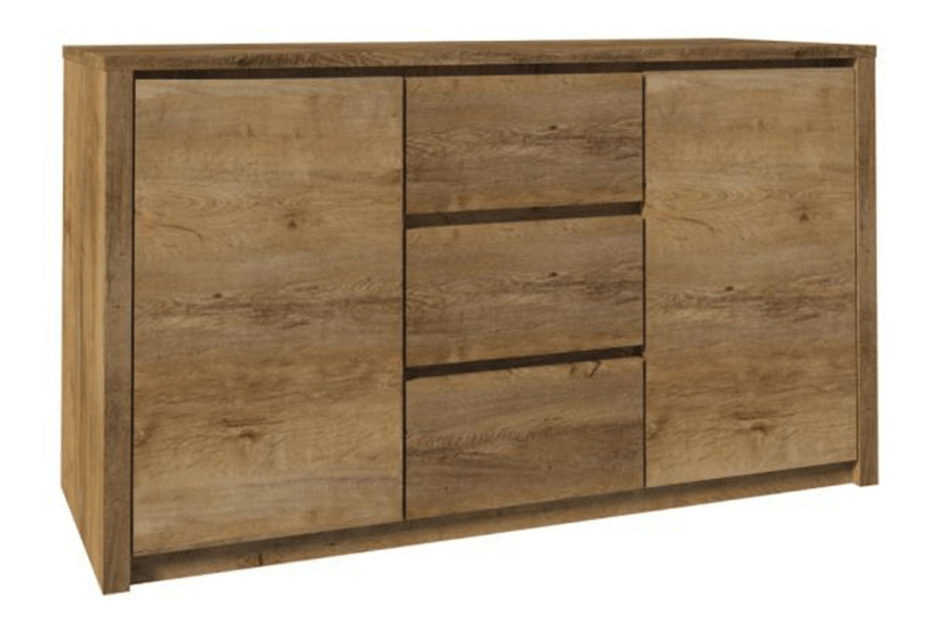 Komoda Montana se dvěma plnými dvířky a třemi zásuvkami uprostřed. Jednoduchý a čistý styl doplňuje pěkné barevné provedení dub lefkas tmavý. Komoda bude nejen elegantním, ale především praktickým doplňkem vašich příbytků.