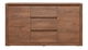 Široká komoda se třemi zásuvkami stejné hloubky umístěnými ve středu nad sebou. Po obou stranách jsou umístěny plná dvířka, za kterými jsou poličky. Barevné provedení dub lefkas má specifickou kresbu a dodává až rustikální výraz masivního neopracovaného dřeva, pokud to tak můžeme vůbec říct.