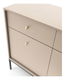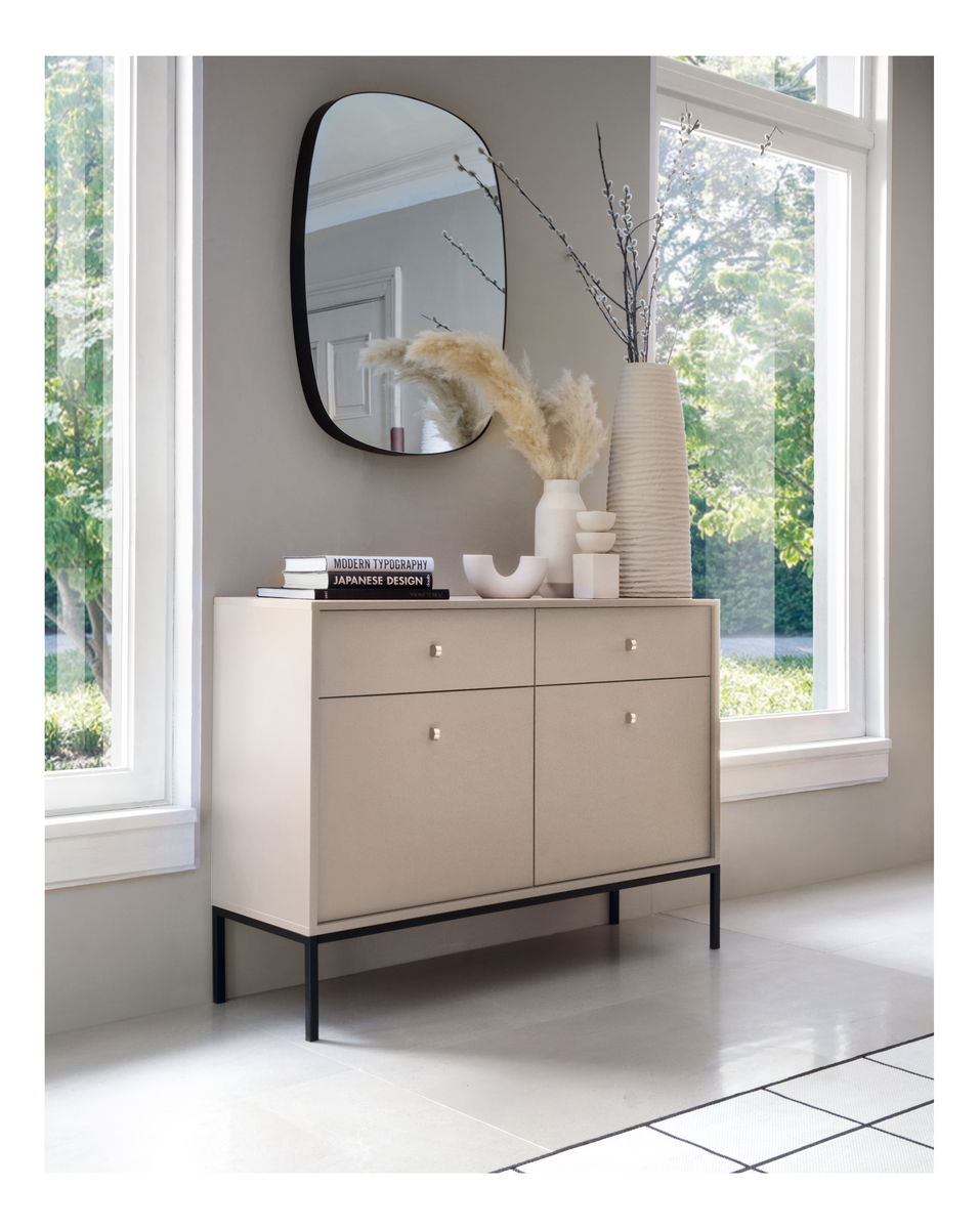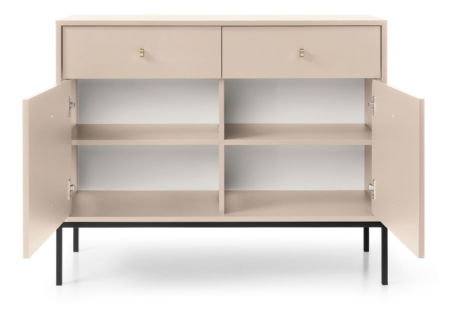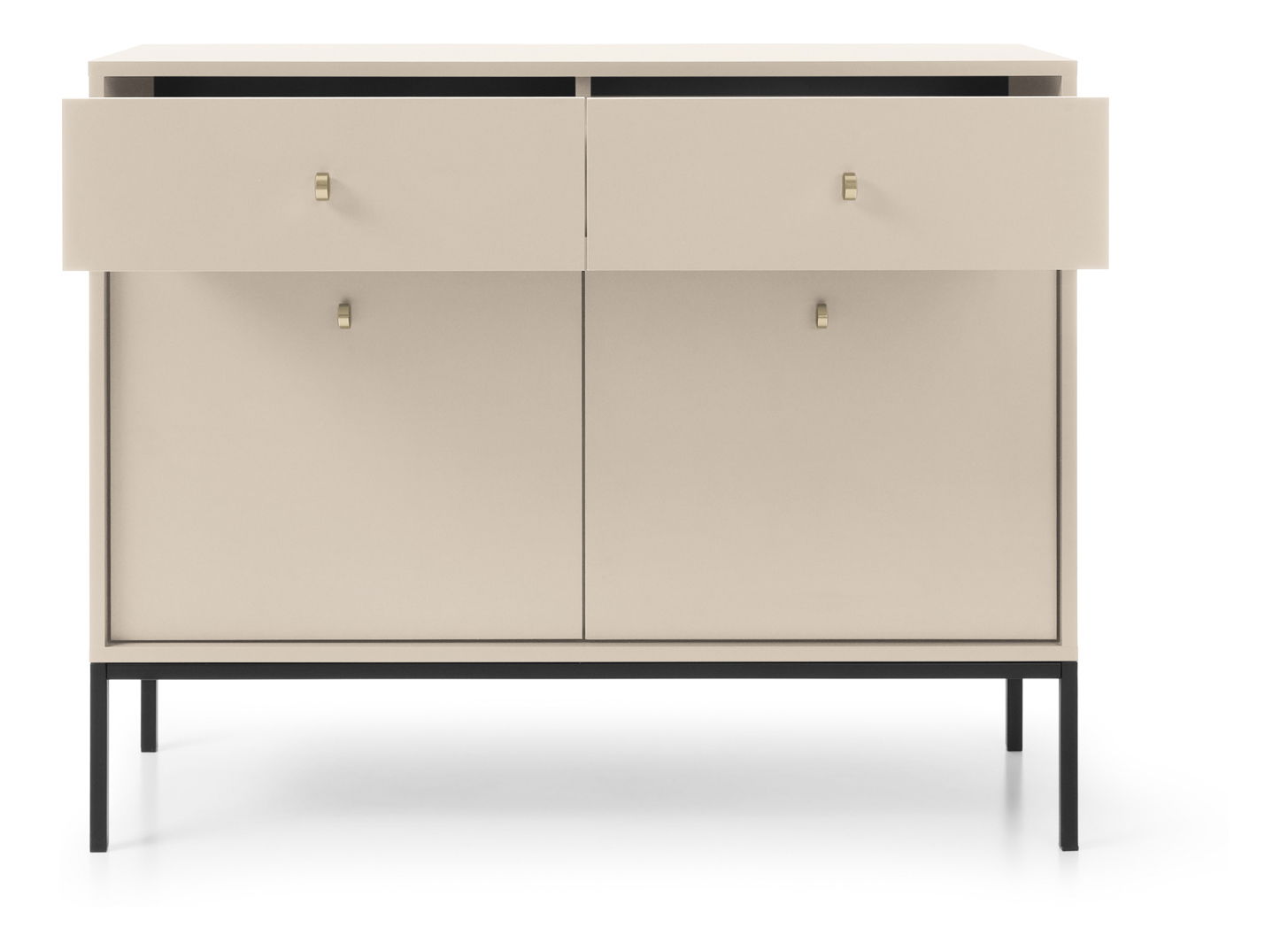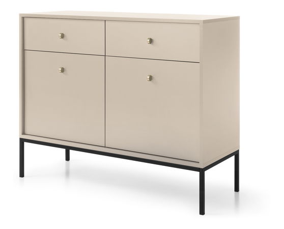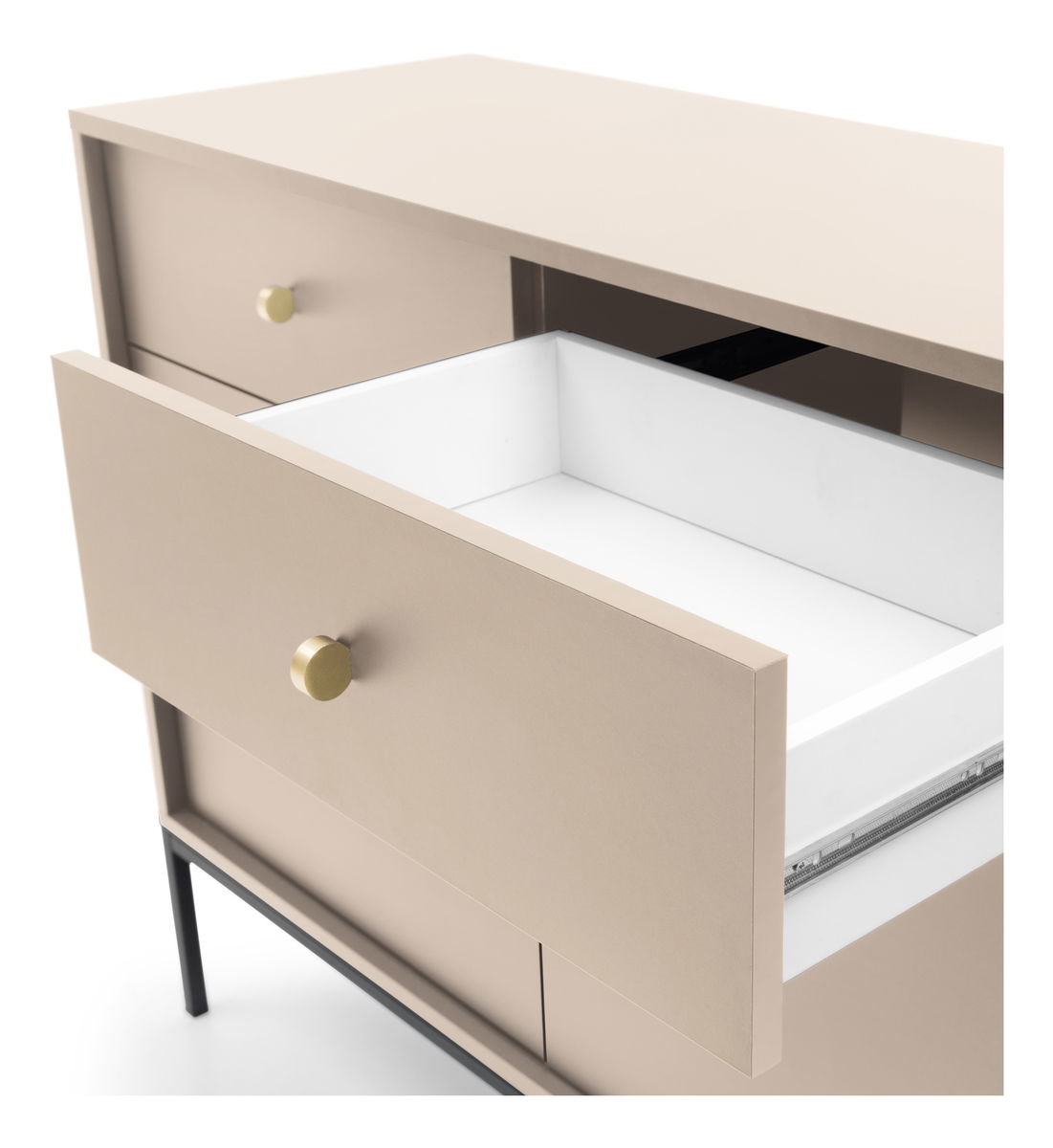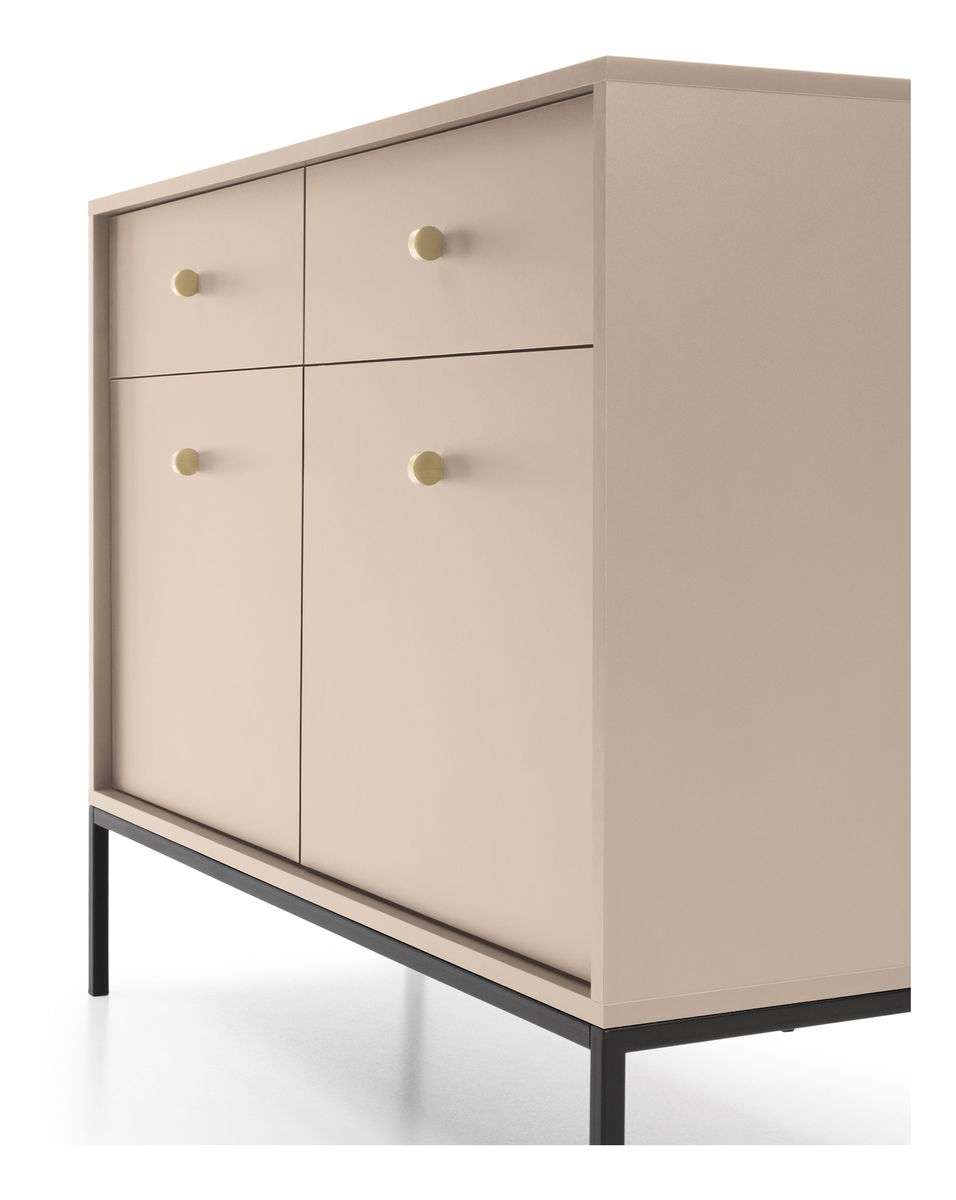 ZobrazitModerní komoda s dvířky a šuplíky Montre si vás získá příjemnou pískovou béžovou barvou. Komoda je ideální pro úschovu všech věcí ať už jsou to společenské hry, sešity nebo alkoholu. Komoda má zlaté úchyty ve tvaru knoflíků a stojí na černých kovových nožičkách. Nábytek je vyroben z 16 mm silné laminované desky ošetřené ABS hranami.