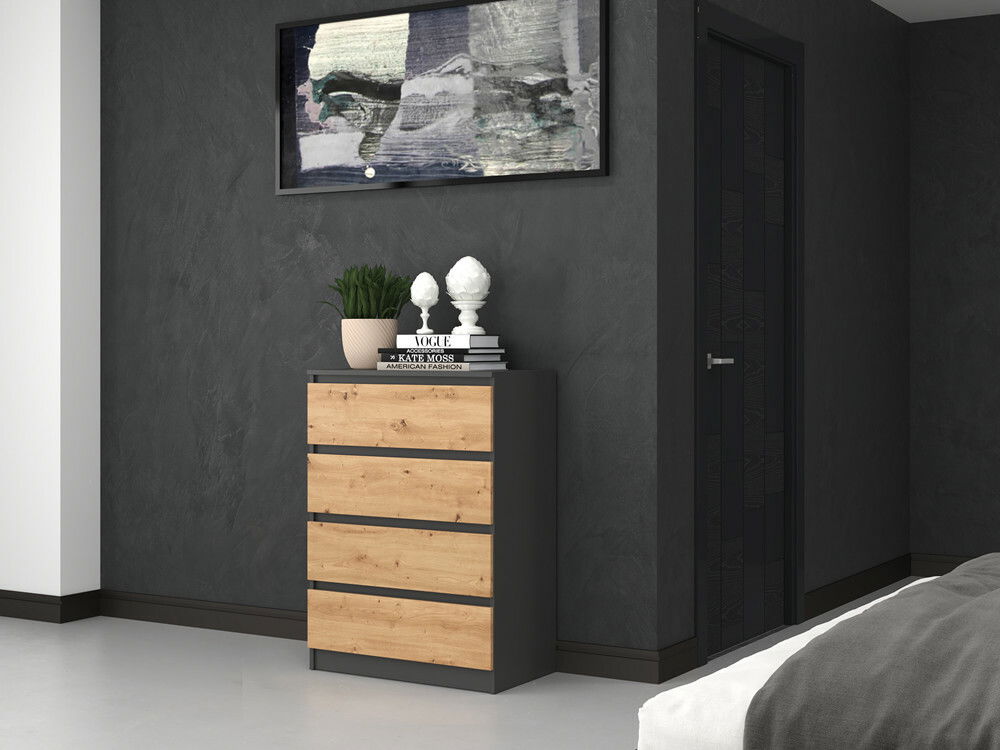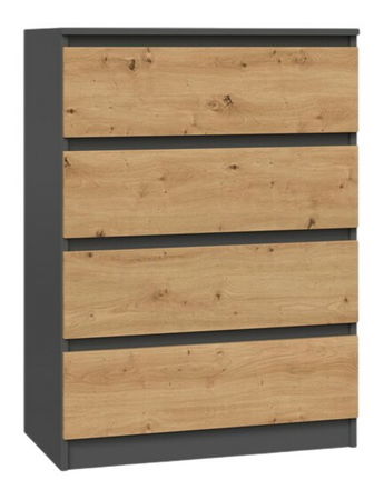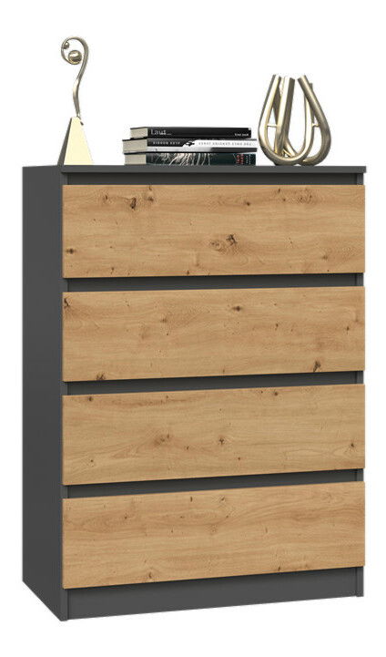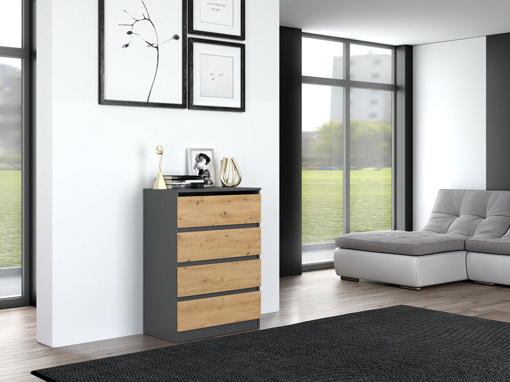 ZobrazitKomoda Musecalo 2 v elegantní kombinaci antracit a dub artisan je ideálním řešením pro moderní interiéry. Její minimalistická konstrukce a bezúchytové fronty zásuvek zaručují pohodlné používání a dodávají prostoru sofistikovaný vzhled. Vyrobená z kvalitní laminované dřevotřísky s ABS hranami, tato komoda je odolná vůči mechanickému a chemickému poškození. S rozměry 70 cm na šířku, 40 cm na hloubku a 97 cm na výšku nabízí dostatek úložného prostoru, přičemž se snadno integruje do ložnice, obývacího pokoje nebo dětského pokoje.