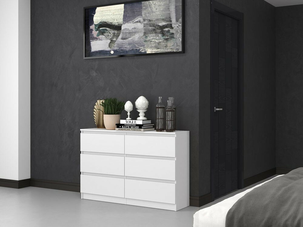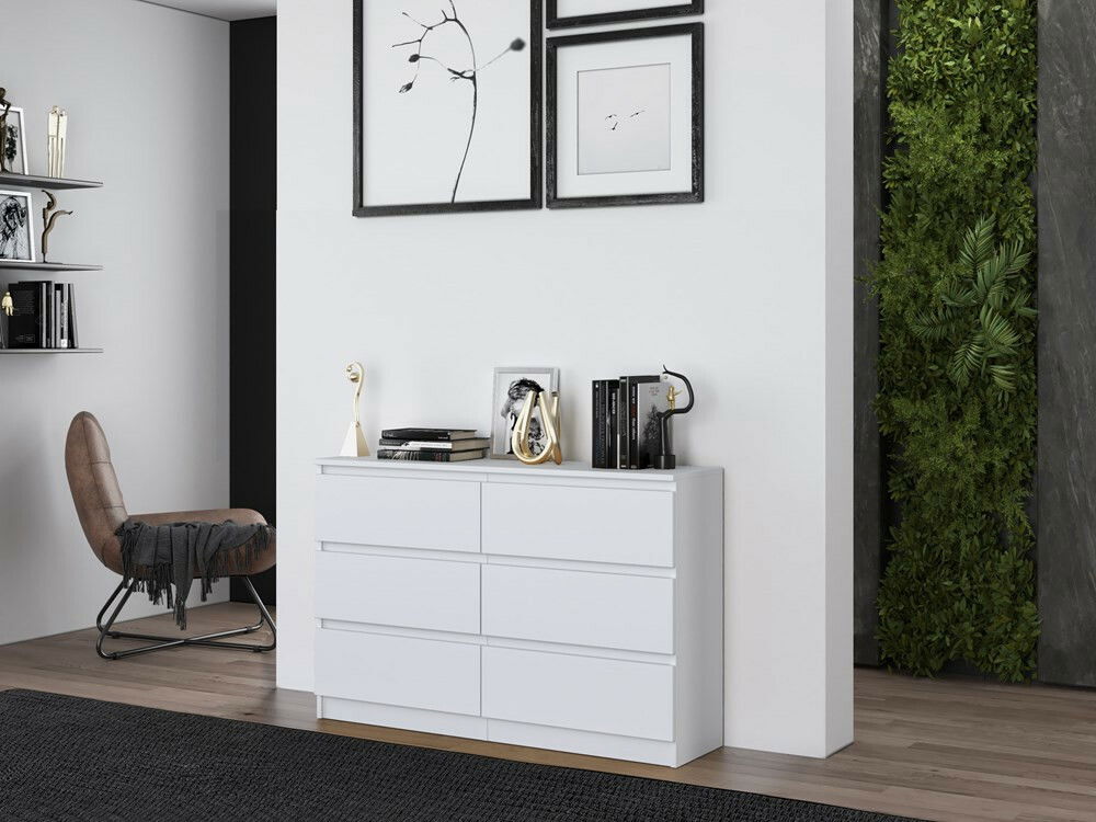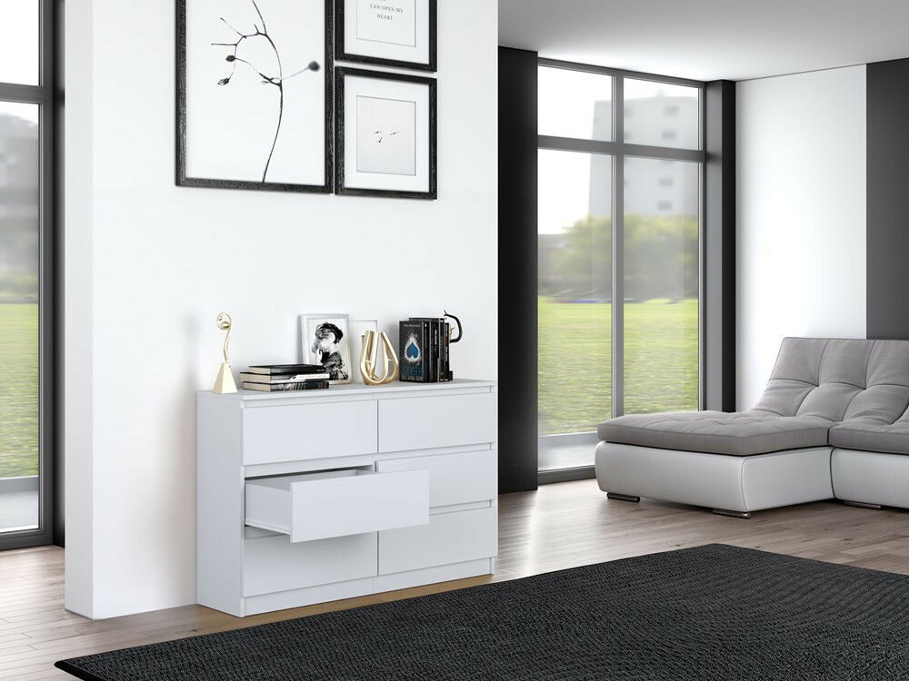 ZobrazitKomoda Musecalo 6 120 v elegantní bílé barvě je ideálním řešením pro moderní interiéry, které si potrpí na funkčnost a stylový design. S minimalistickou konstrukcí a bezúchytkovými frontami nabízí šest prostorných zásuvek, které zajišťují pohodlné a bezpečné používání. Vyrobená z kvalitní laminované dřevotřísky, tato komoda je nejen esteticky příjemná, ale také odolná a snadno udržovatelná. Její univerzální vzhled se hodí do ložnice, obývacího pokoje či dětského pokoje, přičemž splní očekávání i těch nejnáročnějších zákazníků.