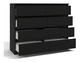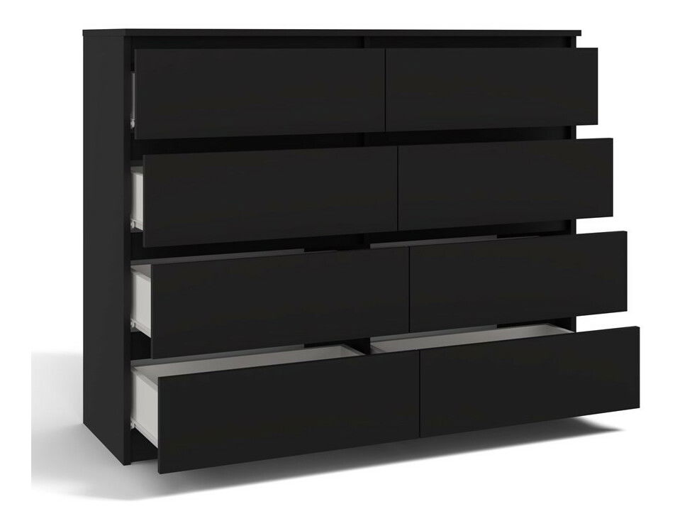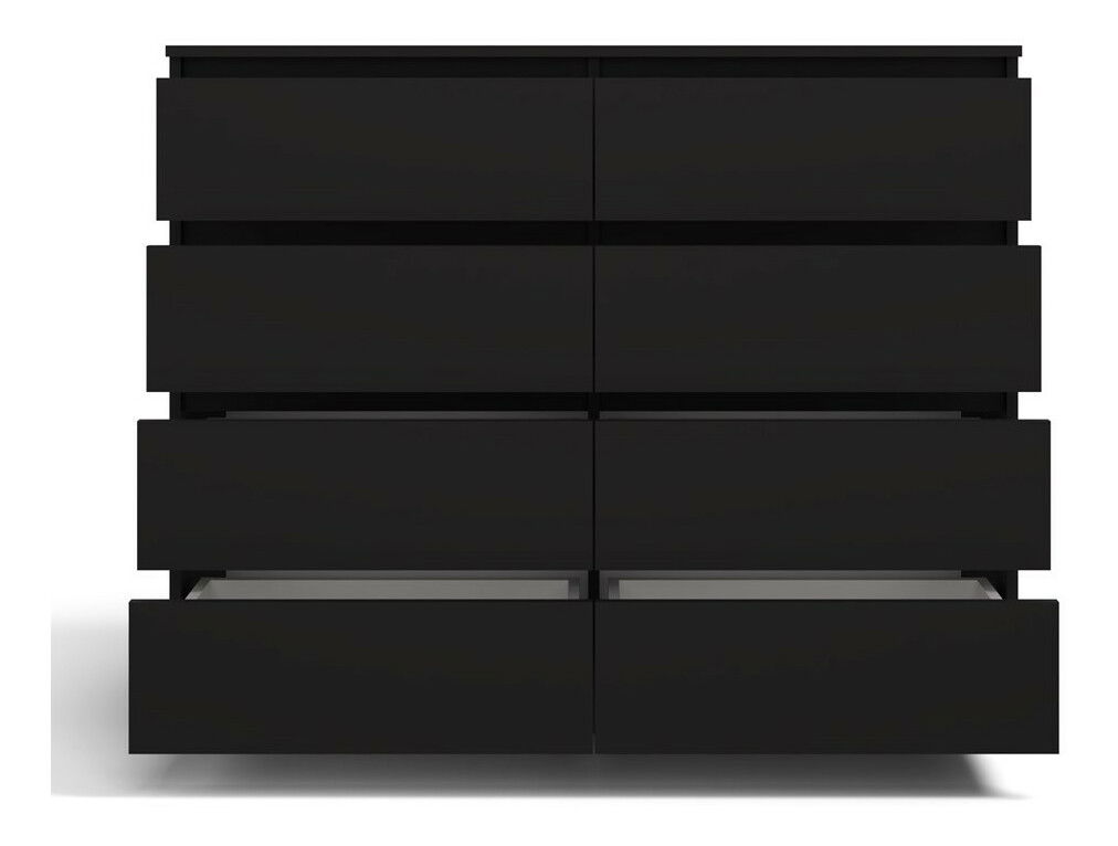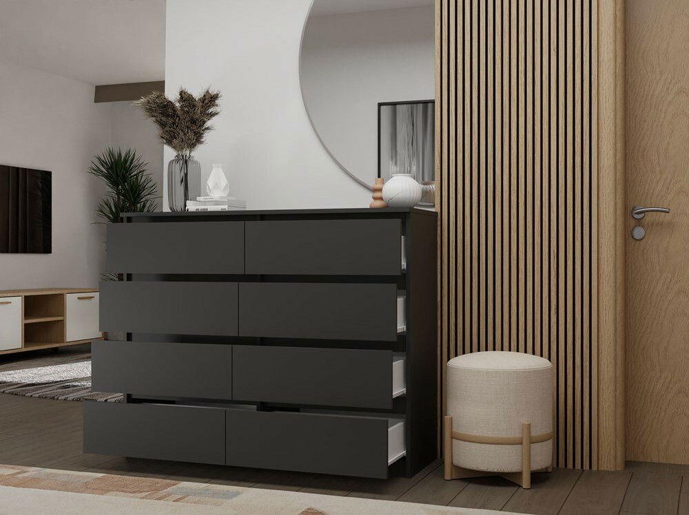 ZobrazitKomoda Musecalo 7 120 v elegantní černé barvě je ideálním řešením pro moderní interiéry, kde se potýká funkčnost s estetikou. S osmi prostornými zásuvkami a minimalistickou konstrukcí nabízí dostatek úložného prostoru, přičemž bezúchytové fronty zajišťují pohodlné používání a podtrhují moderní vzhled. Vyrobená z kvalitní laminované dřevotřísky, tato komoda je nejen praktická, ale také odolná. Její jednoduché čištění a montáž z ní dělají skvělý doplněk do ložnice, obývacího pokoje nebo dětského pokoje.