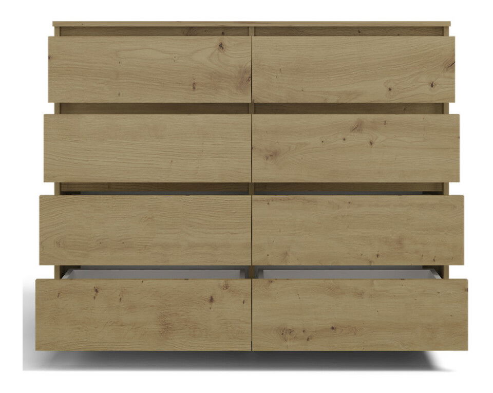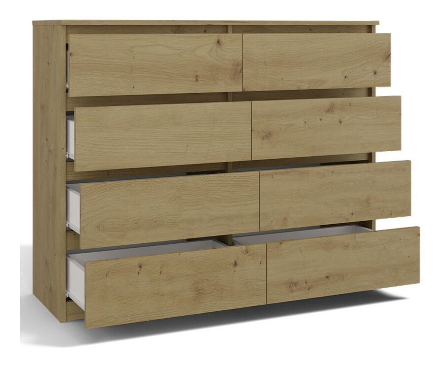 ZobrazitKomoda Musecalo 7 120 v elegantní barvě dub artisan je ideálním řešením pro každou moderní domácnost. S osmi prostornými zásuvkami nabízí dostatek úložného prostoru, přičemž minimalistická konstrukce a bezúchytové fronty zajišťují pohodlné používání a současně podtrhují moderní vzhled interiéru. Vyrobená z kvalitní laminované dřevotřískové desky, tato komoda je nejen funkční, ale také esteticky přitažlivá. Její snadné čištění a bezpečné zásuvky na válečkových vodítkách zaručují dlouhou životnost a praktičnost.