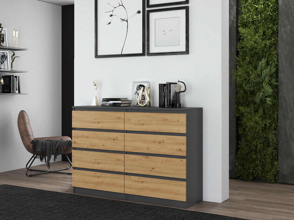 ZobrazitKomoda Musecalo 7140 v elegantní kombinaci antracit a dub artisan je ideálním řešením pro moderní interiéry. S osmi prostornými zásuvkami nabízí dostatek úložného prostoru, přičemž minimalistická konstrukce bezúchytkových front zajišťuje pohodlné používání a podtrhuje její moderní vzhled. Vyrobená z kvalitní laminované dřevotřísky, tato komoda je nejen funkční, ale také esteticky přitažlivá, čímž se stává skvělým doplňkem do ložnice, obývacího pokoje nebo dětského pokoje. Její precizní zpracování a bezpečné mechanismy zaručují dlouhou životnost a spokojenost s každodenním používáním.