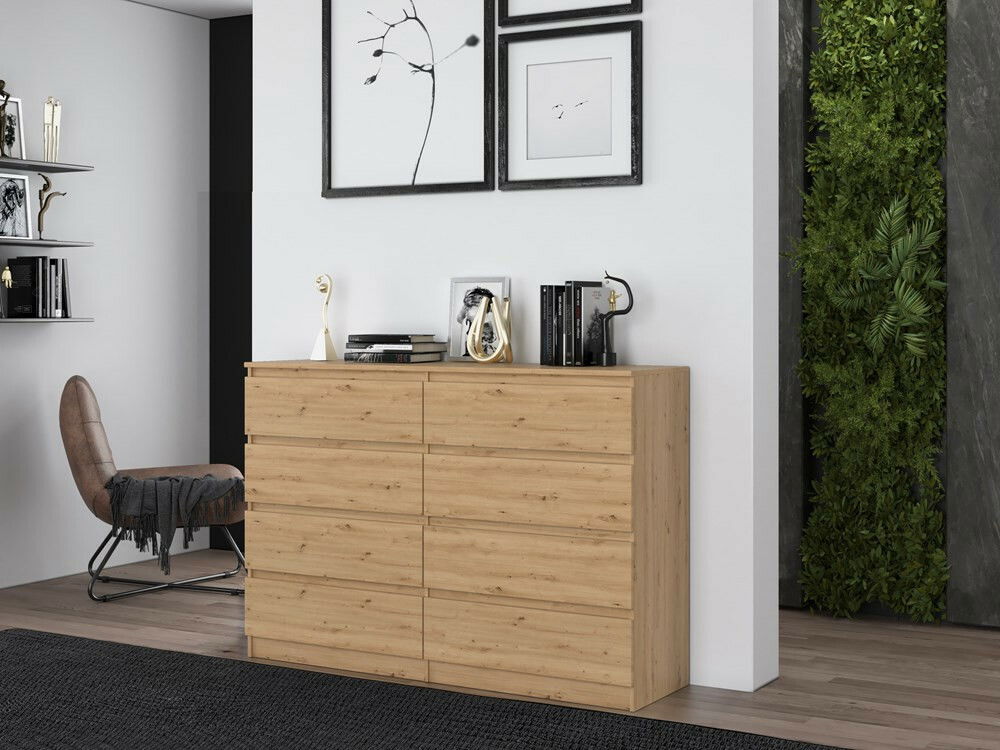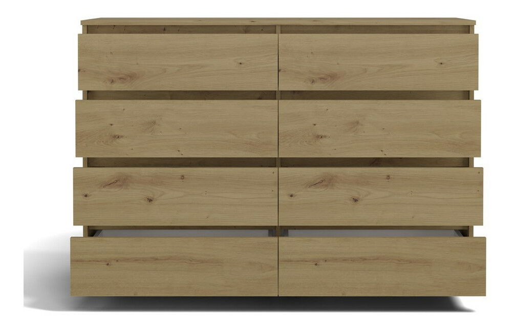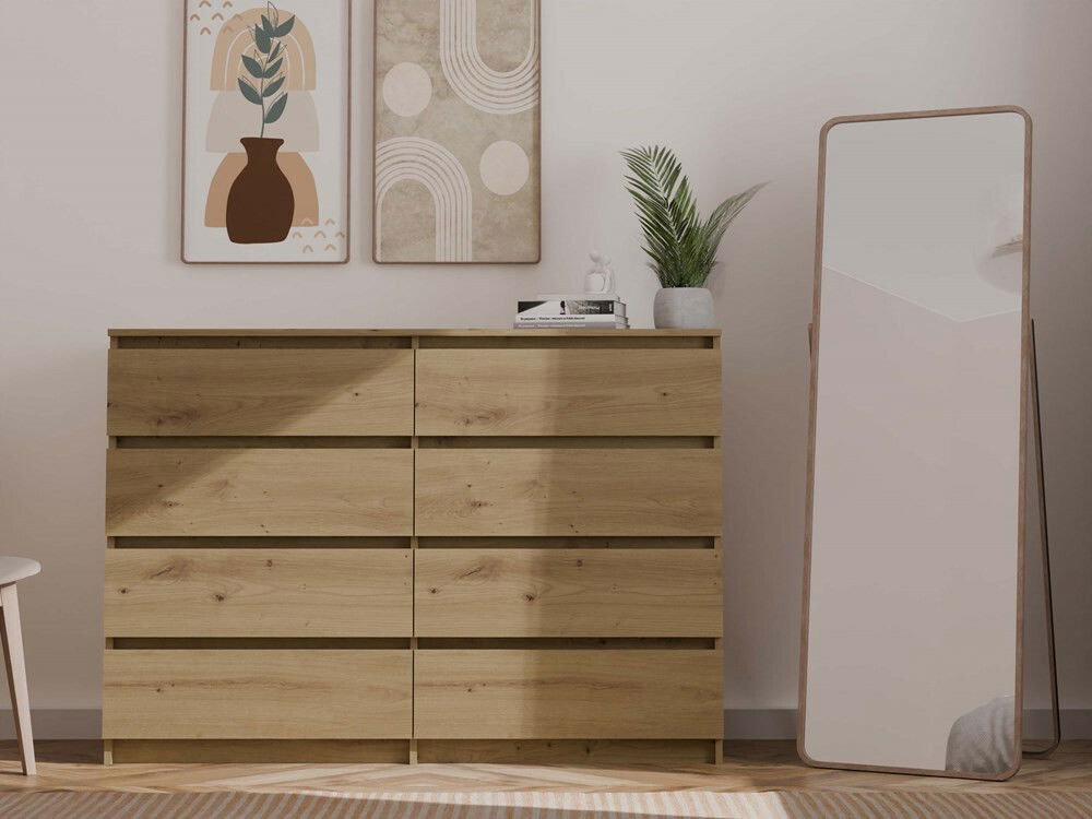 ZobrazitKomoda Musecalo 7 140 v elegantní barvě dub artisan je ideálním řešením pro moderní interiéry, kde se potýká funkčnost s estetikou. S osmi prostornými zásuvkami, které jsou vybaveny bezpečnými válečkovými vodítky, nabízí dostatek úložného prostoru pro všechny vaše potřeby. Minimalistická konstrukce bezúchytkových front dodává nábytku moderní vzhled, zatímco kvalitní zpracování z laminované dřevotřísky zajišťuje dlouhou životnost. Tato komoda je skvělou volbou pro ložnice, obývací pokoje či dětské pokoje, přičemž její univerzální design osloví každého, kdo hledá kombinaci jednoduchosti a elega