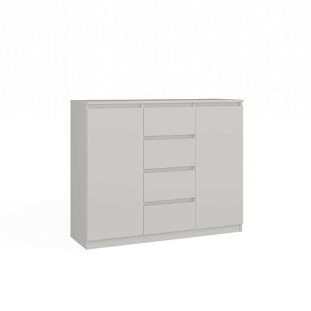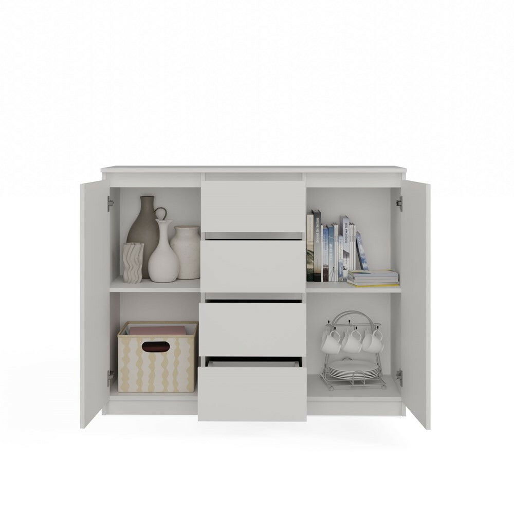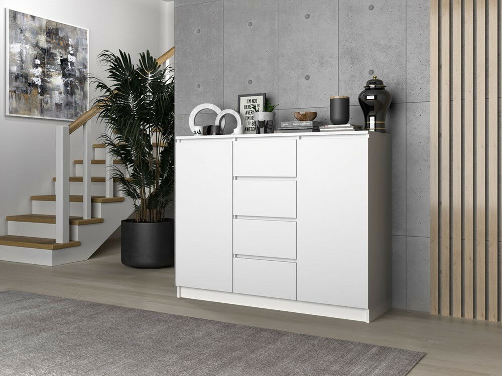 ZobrazitKomoda Musecalo 8 v elegantní bílé barvě je ideálním řešením pro moderní interiéry, ať už do ložnice, obývacího pokoje nebo dětského pokoje. Se dvěma páry dveří a čtyřmi prostornými zásuvkami nabízí dostatek úložného prostoru, přičemž minimalistický design bez úchytek zaručuje pohodlné používání a současně podtrhuje moderní charakter nábytku. Vyrobená z kvalitní laminované dřevotřísky s ABS hranami, komoda je nejen estetická, ale také odolná vůči mechanickému a chemickému poškození. Tento kus nábytku je skvělou volbou pro ty, kdo hledají kombinaci funkčnosti a stylu.