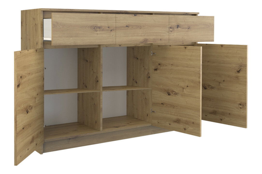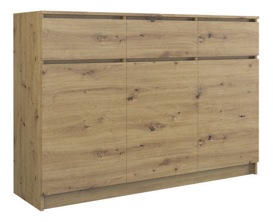 ZobrazitKomoda Musecalo 9 v elegantní barvě dub artisan je ideálním řešením pro každou moderní domácnost. Se třemi páry dveří a třemi zásuvkami nabízí dostatek úložného prostoru, přičemž minimalistická konstrukce bezúchytkových front zajišťuje pohodlné používání a současně podtrhuje moderní vzhled interiéru. Vyrobená z kvalitní laminované dřevotřísky s ABS hranami, tato komoda je nejen esteticky příjemná, ale také odolná vůči mechanickému a chemickému poškození. S její pomocí si jednoduše zařídíte ložnici, obývací pokoj nebo dětský pokoj.