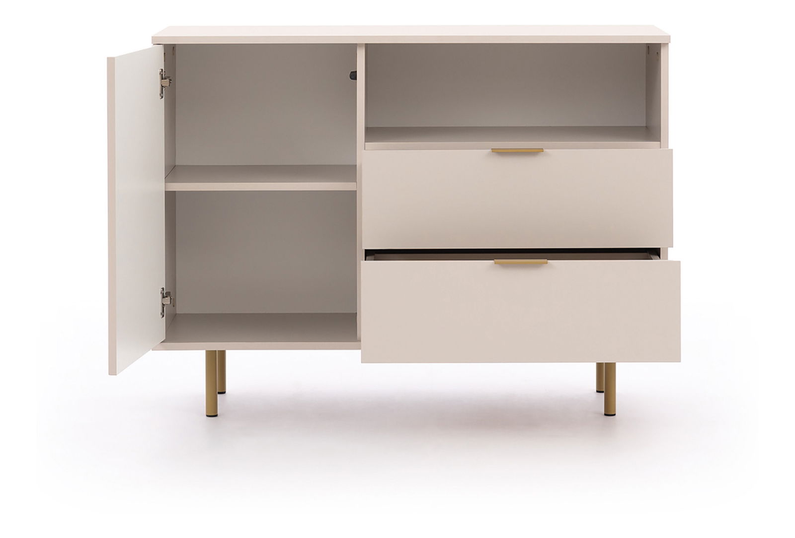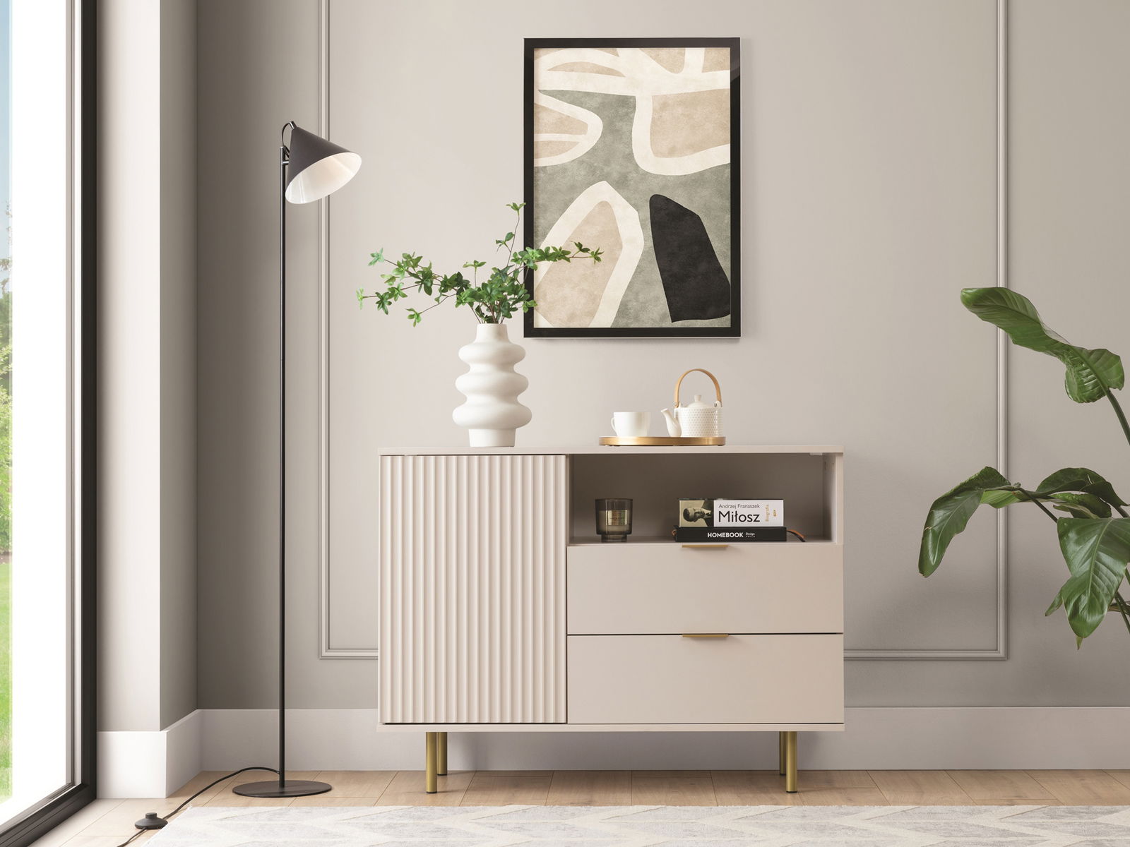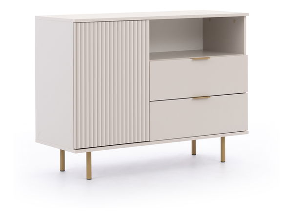 ZobrazitKomoda Nalani K1D2SZ (kašmírová) je moderní a elegantní kus nábytku, který se skvěle hodí do každého interiéru. Je vyrobena z 16 mm silné dřevotřísky a má posílenou zadní stranu s 3 mm HDF deskou. Komoda je odolná proti poškrábání díky ABS hraně a má dlouhou životnost. Frézovaná dvířka bez úchytu dodávají nábytku minimalistický vzhled. Komoda má nožičky s elegantní zlatou barvou a výškou 15 cm, což usnadňuje čištění pod komodou. Kovové úchytky ve zlaté barvě se skládají s nožičkami. Systém otevírání dveří „push to open“ umožňuje snadné otevírání bez úchytu. Zásuvky jsou vybaveny vodítky pro tiché a hladké zavírání. Komoda má jedny dvířka, dvě zásuvky a jednu poličku, plus jednu otevřenou poličku nad zásuvkami. Nabízí dostatek úložného prostoru a možnost efektivního uspořádání věcí.