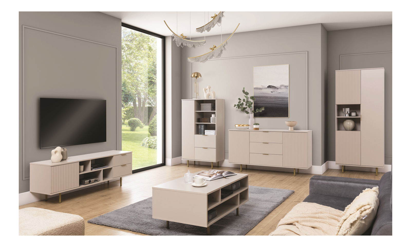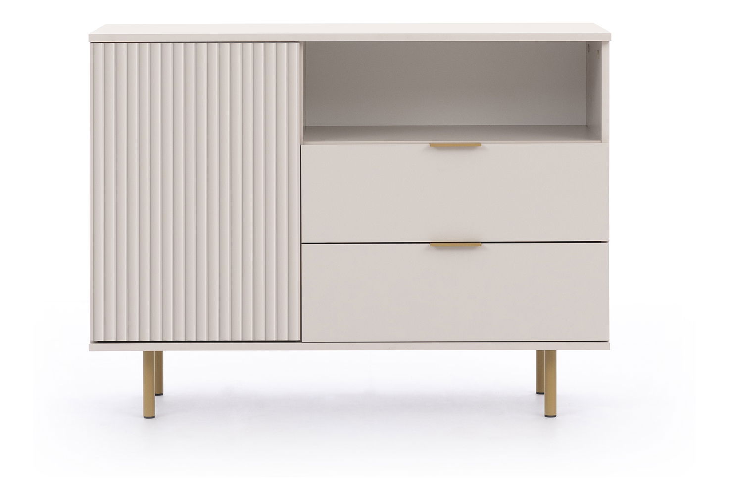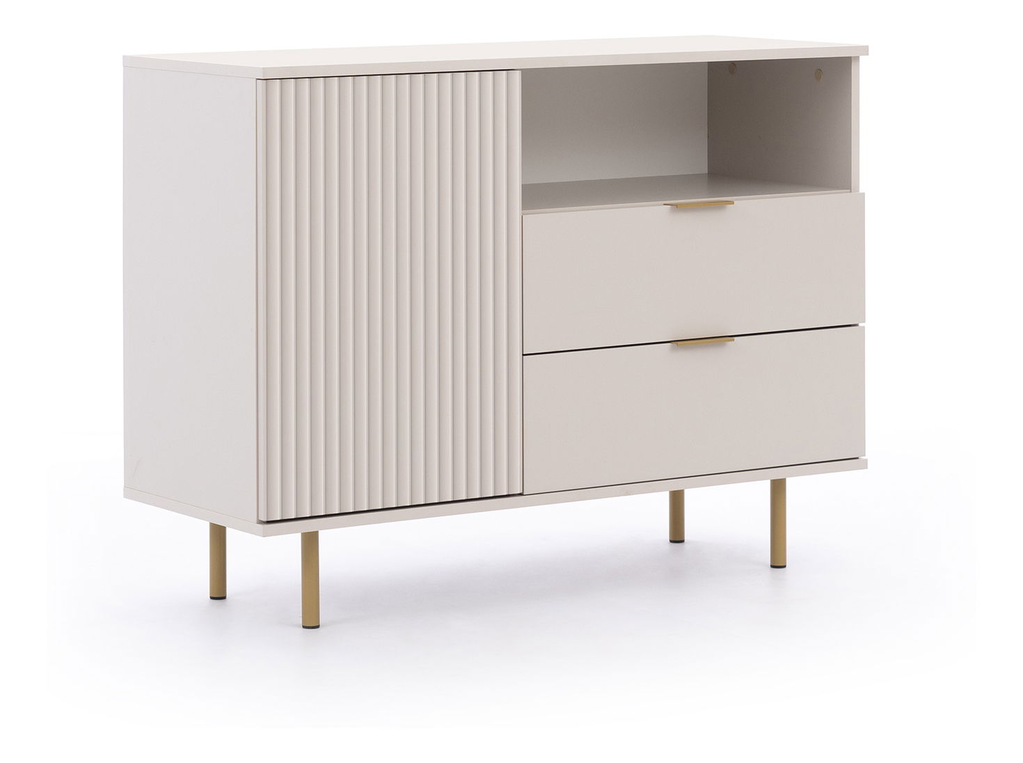 ZobrazitKomoda Nalani K1D2SZ (kašmírová) je moderní a elegantní kus nábytku, který se skvěle hodí do každého interiéru. Je vyrobena z 16 mm silné dřevotřísky a má posílenou zadní stranu s 3 mm HDF deskou. Komoda je odolná proti poškrábání díky ABS hraně a má dlouhou životnost. Frézovaná dvířka bez úchytu dodávají nábytku minimalistický vzhled. Komoda má nožičky s elegantní zlatou barvou a výškou 15 cm, což usnadňuje čištění pod komodou. Kovové úchytky ve zlaté barvě se skládají s nožičkami. Systém otevírání dveří „push to open“ umožňuje snadné otevírání bez úchytu. Zásuvky jsou vybaveny vodítky pro tiché a hladké zavírání. Komoda má jedny dvířka, dvě zásuvky a jednu poličku, plus jednu otevřenou poličku nad zásuvkami. Nabízí dostatek úložného prostoru a možnost efektivního uspořádání věcí.