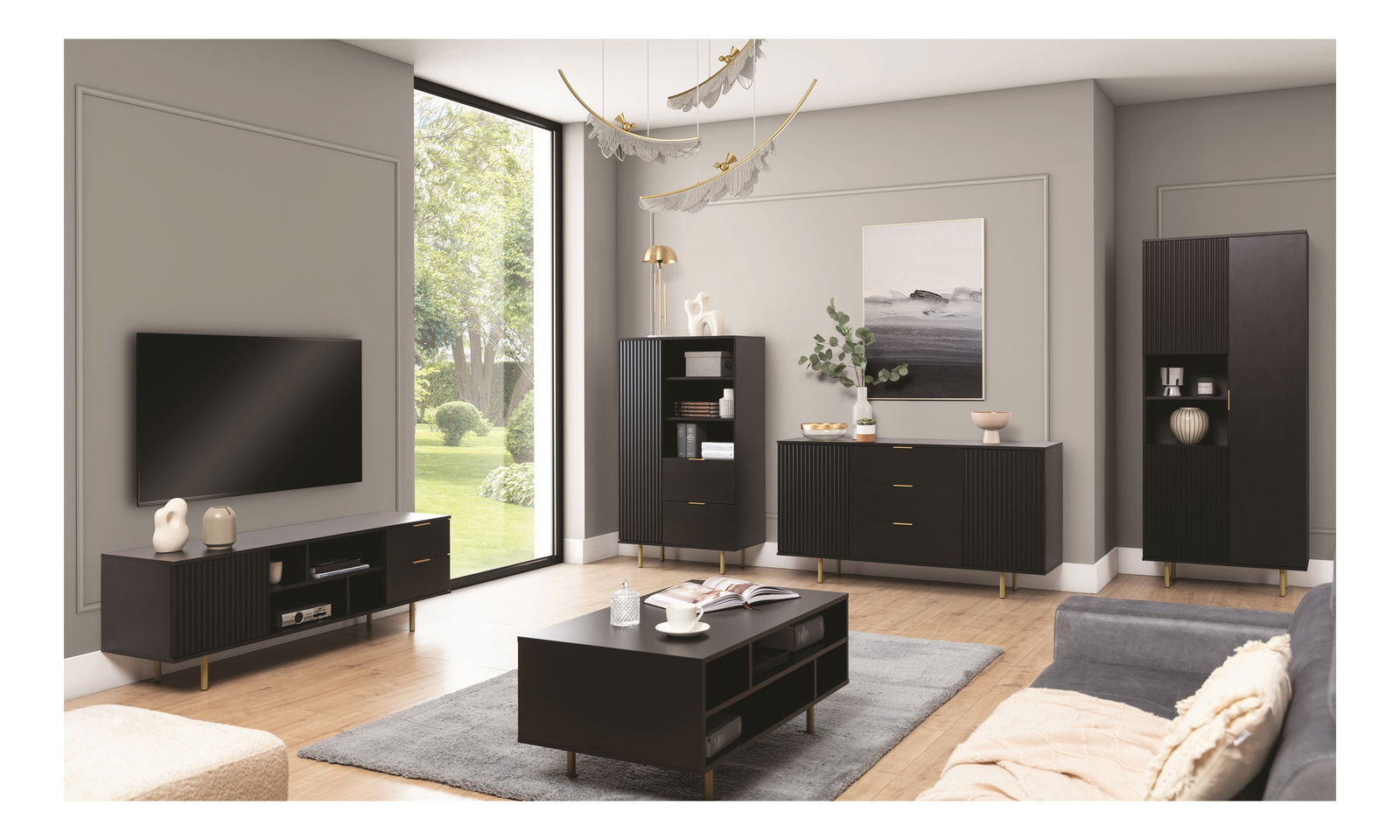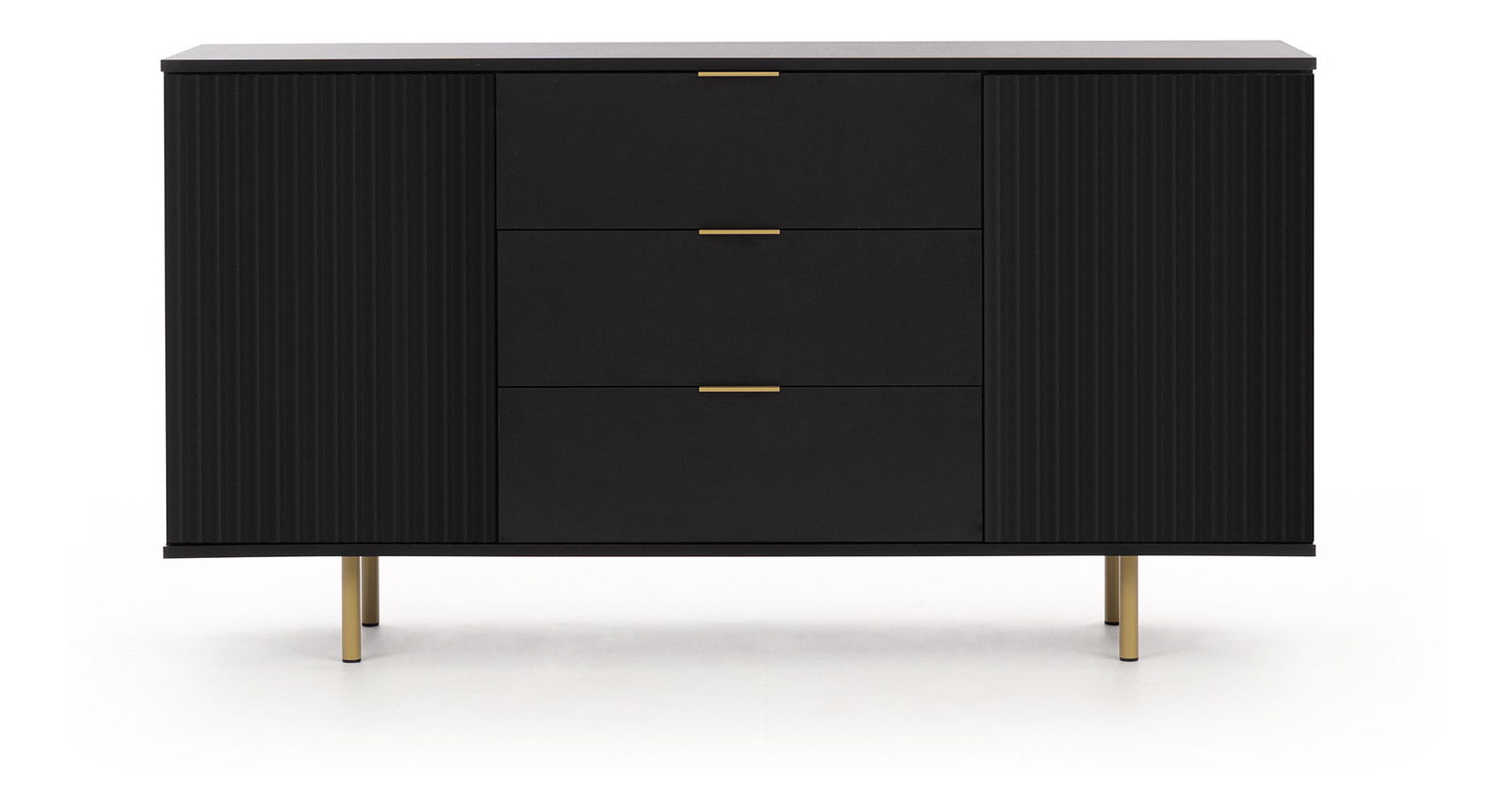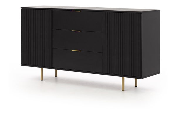ZobrazitElegantní komoda Nalani K2D3SZ (černá) o výšce 80 cm, šířce 150 cm a hloubce 41 cm je vyrobena z 16 mm silné dřevotřísky, což zaručuje její robustnost a pevnost. Komoda má zadní stranu z 3 mm HDF desky, což zajišťuje stabilitu a trvá. ABS hrany na okrajích komody jsou odolné vůči nárazem a chrání ji před poškozením. Stylová frézovaná dvířka bez úchytky přidávají moderní vzhled a zjednodušují čištění. to open". Zásuvky jsou vybaveny vodítky se zpomalovačem, což zajišťuje tiché a hladké zavírání. Komoda má dvě dvířka a tři zásuvky, které poskytují dostatek prostoru pro uskladnění. Se dvěma poličkami je tato komoda praktickým a stylovým doplňkem pro váš domov.