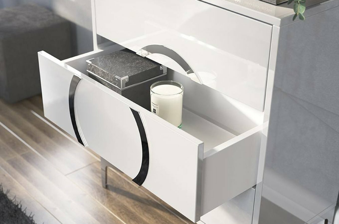 ZobrazitKomoda Naturlig Barnir (vysoký lesk bílý) vysoce lesklý povrch s akrylovým zrcadlem, který okamžitě přitáhne pozornost a dodá interiéru zářivý vzhled. Komoda má výšku 83,4 cm a hloubku 38 cm. Vnitřní rozměry zásuvek jsou 14,7 cm x 62,4 cm x 30,2 cm (v.š.h.) a výška předních panelů zásuvek je 21,2 cm. Korpus a přední panely jsou vyrobeny z laminované dřevotřísky o tloušťce 18 mm, zadní strana a dno zásuvek jsou vyrobeny z HDF a korpus zásuvek z laminované dřevotřísky o tloušťce 16 mm. Nožičky jsou vyrobeny z chromované oceli a mají výšku 13,4 cm. Komoda má skryté vodící lišty pro otevírání zásuvek technologií push to open. Díky svému modernímu designu a praktickým vlastnostem se tato komoda stane ideálním doplňkem pro váš domov.