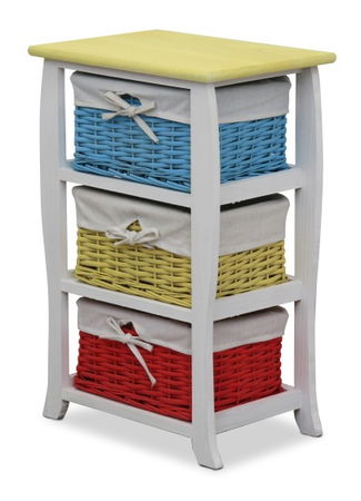 Komoda, kterou si zkrášlíte a zútulníte vaše interiéry. Komodu vystihují prvky rustikálního stylu - dřevěný rám, tři proutěné košíky ozdobené mašličkami, zaoblené nohy. Bude krásným doplňkem předsíní, koupelen, ložnic nebo obývacích pokojů. Barevné provedení komody je bílá v kombinaci s různými barvami zásuvek.