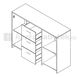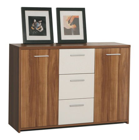 Třídílná komoda se třemi zásuvkami ve střední části a úložným prostorem s poličkami po stranách. Vyrobena je z foliované DTD. Pěkná kresba dřeva ořech vlašský je v kombinaci s bílými prvky. Je vhodná jako doplněk k obývací stěně Nikita PCOM01.