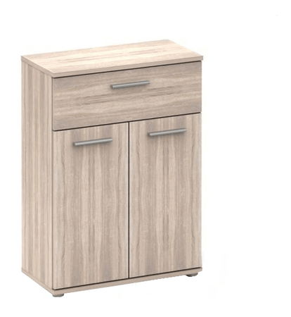 Komoda Notrea Typ 33 o výšce 82 cm a hloubce 29 cm je vybavena 2 dvířky a jednou zásuvkou v horní části. Tento svěží nábytek v provedení dub sonoma je ideální pro zařízení studentských a dětských pokojů, ložnic, běžných kanceláří, pokoj pro hosty, případně obývacích pokojů. Stavební materiál je DTD foliovaná a obsahuje šedé úchyty. Rozměry zásuvky jsou 52,5 x 15,5 cm a tloušťka materiálu je 16 mm. Plastové nožičky mají výšku 1,5 cm. Tento produkt má rozměry 60x29x82 cm a dodává se v demontu.