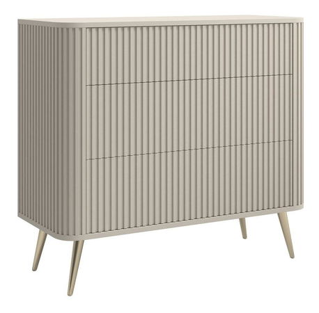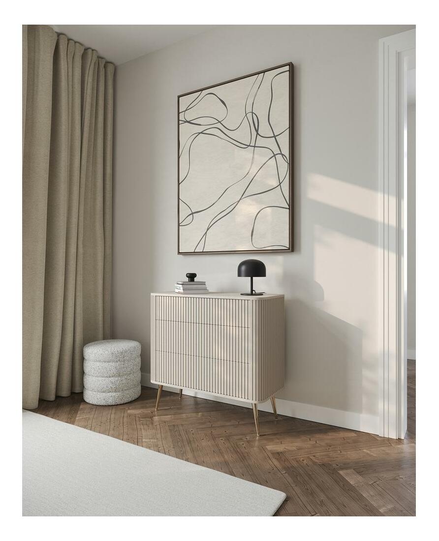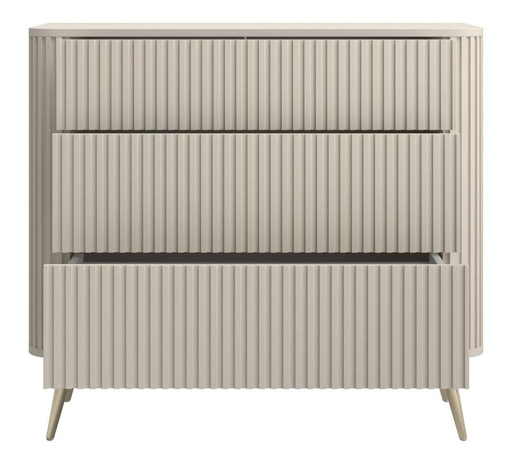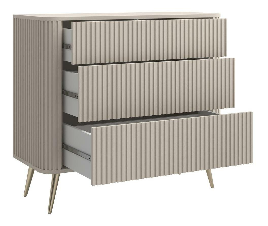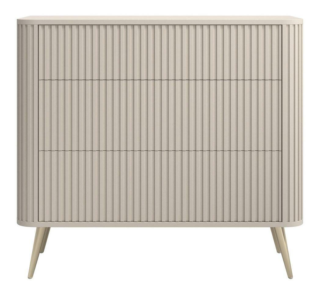 ZobrazitChcete, aby váš interiér potěšil moderním designem a praktickými řešeními? Kolekce nábytku splní vaše očekávání, vyrobená z odolné laminované dřevotřískové desky a laminované MDF fólie, nabízí pevnost a styl, který vydrží dlouhá léta a zaručují dlouhodobé používání Kolekce umožňuje kreativní a libové uspořádání prostoru, dokonale přizpůsobené vašim potřebám. Díky systému otevírání push to open se používání nábytku stává jednoduchým a pohodlným, odpadá nutnost používání tradičních úchytek Vysoké kvé nohy dodávají nábytku lehkost a moderní charakter a rýhovaná čela dodávají jedinečný vzhled. Kolekce nabízí různé barevné varianty, díky čemuž dokonale ladí s vaším interiérem. Promyšlená úložná řešení, jako jsou zásuvky a skříňky, nabízejí dostatek prostoru pro vaše věci, pomáhají udržovat pořádek ve vaší domácnosti Výběrem nábytku investujete do stylu, pohodlí a praktičnosti, které každý den potěší vaše oko. komoda se třemi zásuvkami, rýhovaná čela, korpus z 18 mm laminované MDF fólie a 16 mm laminované dřevotřískové desky, čela z 18 mm laminované MDF folie, vršek z laminované dřevotřísky 16 mm, hrana PVC 0,8 mm, zadní stěna ,2 mm, vysoké kvé nožičky, barva nohou zlatá, barva šedo-béžová (písková béžová U16003), tiché zavírání zásuvek, systém push to open, koule vedení zásuvek.