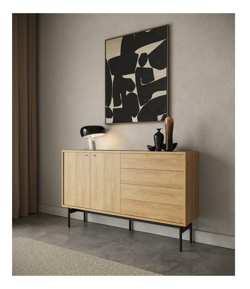 ZobrazitChcete změnit vzhled vašeho interiéru? Výběrem naší kolekce potěšíte své hosty tím, že vnesete do svého obývacího pokoje jedinečné uspořádání zdůrazňující jemnost, eleganci a zároveň harmonii. Komoda s jedinečným designem dokonale zapadne do moderních interiérů. Je vyroben z kvalitní laminované dřevotřískové desky, která zajišťuje dlouhodobé a bezproblémové používání. Jeho charakter obohacuje pevný rám vyrobený z oceli, který činí nábytek nejen odolným, ale dodává mu i industriální šarm. Rafinovaný detail v podobě zlatých úchytek je zase nejen praktickým prvkem, který usnadňuje otevírání, ale dodává celé skříňce také jemný lesk. Komoda byla navržena s ohledem na funkčnost, proto má čtyři zásuvky a uzavřený výklenek se dvěma policemi na různé druhy předmětů. Přírodní hikor, jemně zvýrazňující teplo a přirozenost dřeva, v kombinaci s černým rámem a zlatými úchyty dodává interiéru jemný, ale rafinovaný charakter. Tento kus nábytku je nejen praktickým úložným řešením, ale také designovým prvkem, který zdůrazní individuální styl každé místnosti. Kolekce - vyberte si dokonalost pro svůj interiér ještě dnes Detaily produktu: korpus a čela z přírodní hikorové laminované desky H3730 ST10, rám z černé prášek lakované oceli, která usnadňuje udržování pořádku pod nábytkem, zásuvky otevírané zatlačením! -to-method open', rukojeti zlaté barvy z broušené oceli.