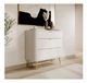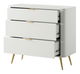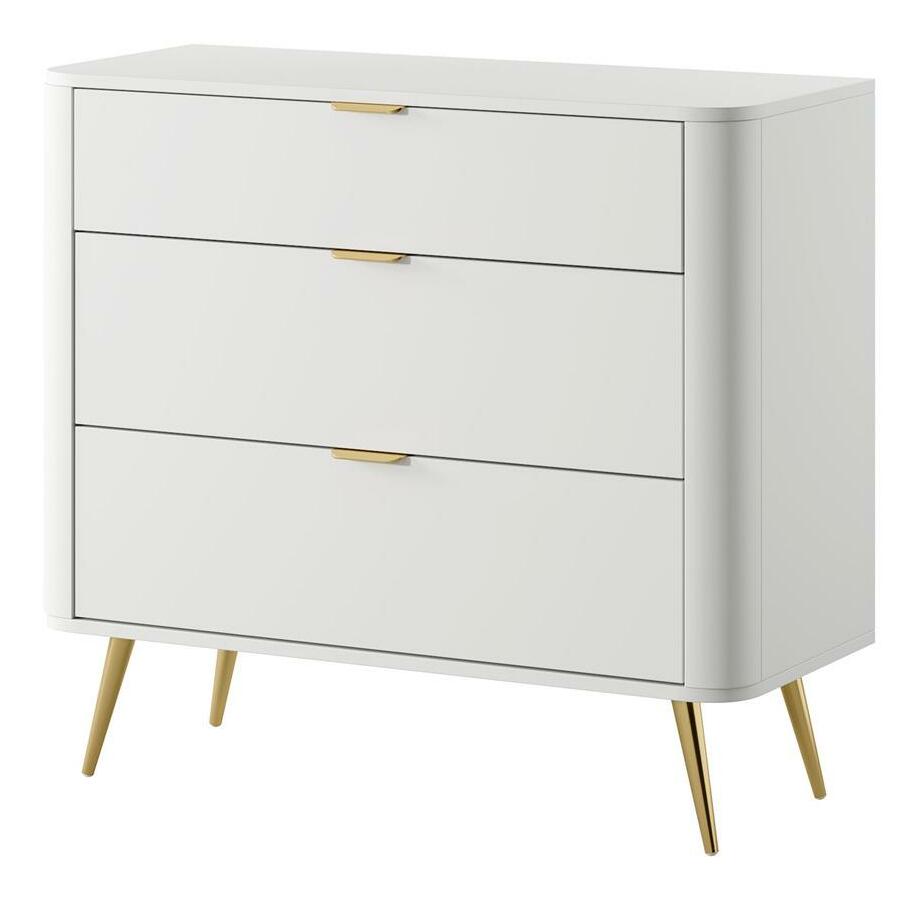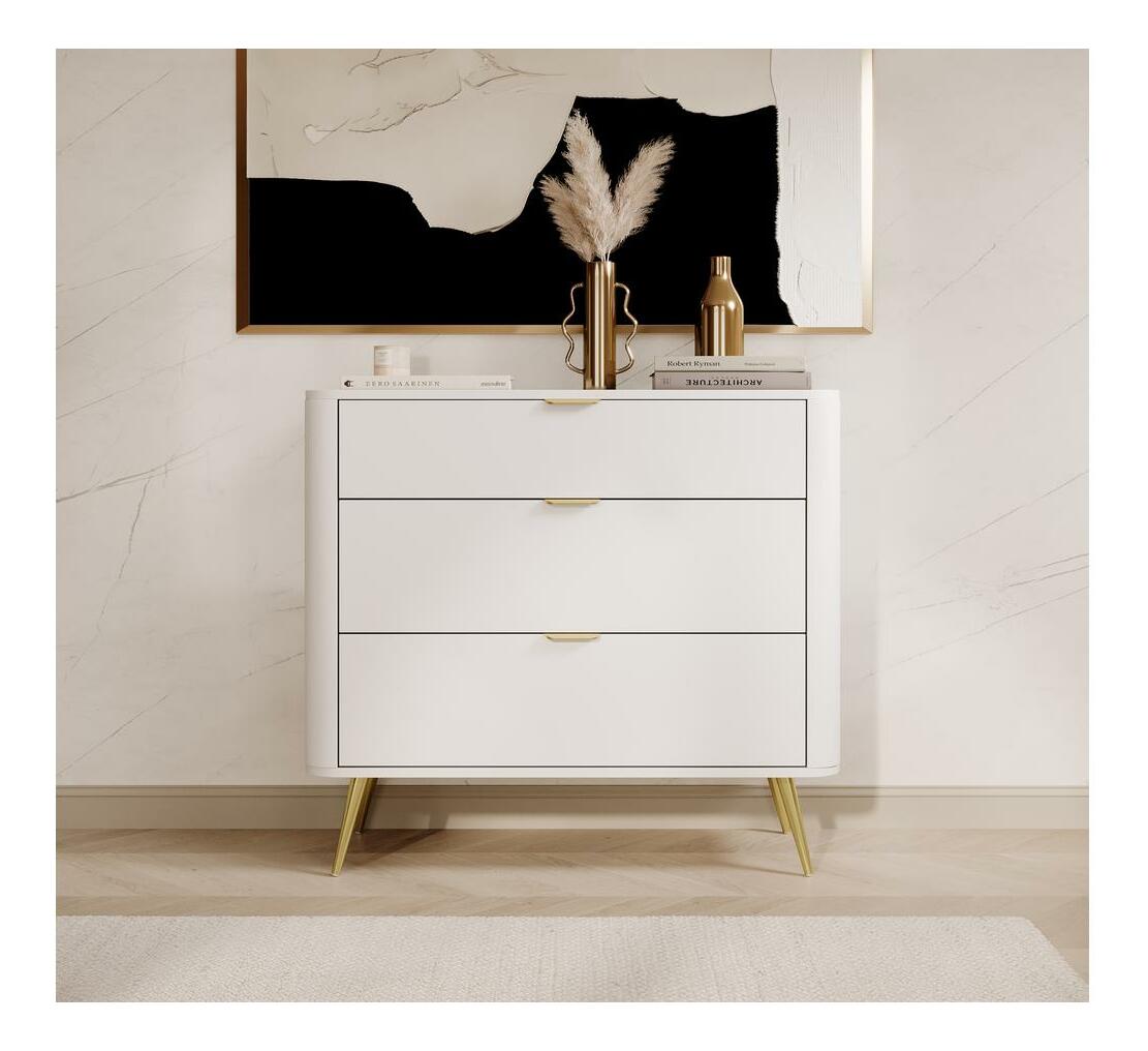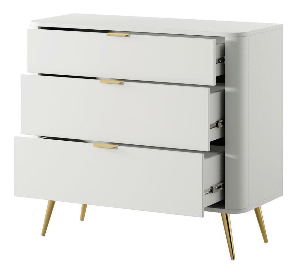 ZobrazitNudí vás klasické tvary nábytku? Chcete změnit svůj byt? Vyberte si kolekci a překvapte všechny své hosty Komoda je moderním kusem nábytku, který překvapí svým tvarem, dodávají eleganci a jsou vhodné pro děti. Komoda má tři prostorné zásuvky, do kterých se vejde vše potřebné: drobná elektronika, dokumenty, oděvy nebo kancelářské potřeby. Další výhodou je stolová deska, na kterou můžete umístit elegantní vázu, fotografie blízkých nebo čerstvé květiny. Moderní tvar dodává interiéru lehkost a činí jej útulnějším Detaily produktu: korpus a čela z laminované nábytkové desky Kronospan 6459 SM v barvě Platinum White, konstrukce vyztužená ABS hranami, které mu dodávají stabilitu a odolnost, vysoké ocelové nohy povrch upravené chromem. zlaté, mají malé bílé nožičky, které zabraňují poškrábání podlahy, zásuvky umístěné na 27 mm kuličkových vodítkách, jemné zlaté, broušené úchyty dodávají funkčnost a jsou stylu ozdobou čel.