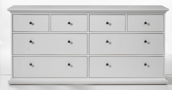 Elegantní komoda se 4 širokými zásuvkami a 4 úzkými zásuvkami umístěnými pod horní deskou.