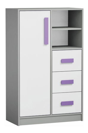Šikovná moderní komoda Piere, která vynikne v dětských a studentských pokojích. Funkcionalita je dobře zkombinovaná s přitažlivým designem komody. Komoda má jedny dvířka, dvě poličky a tři zásuvky. Barevné provedení komody je kombinace bílé a šedé barvy. Úchyty dvířek a zásuvek jsou fialové.