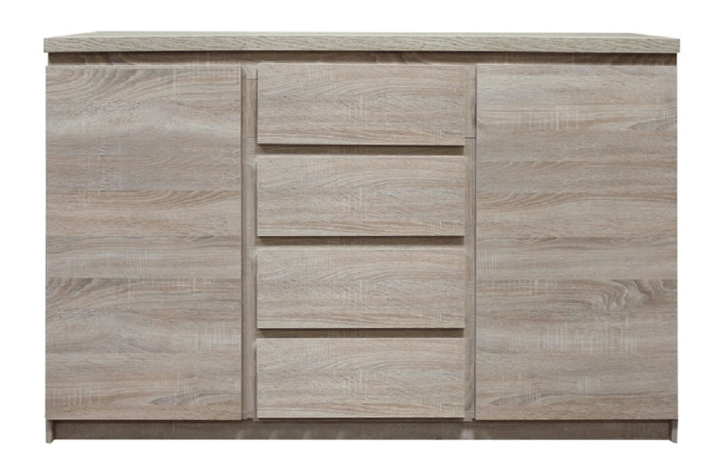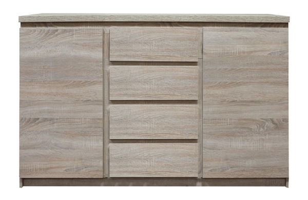 Komoda Punkto Typ 08 2D4S výška 88 cm hloubka 41 cm Dub Sonoma je ideálním doplňkem vašeho obývacího pokoje. Má dvě dveře umístěné po stranách a čtyři zásuvky nad sebou uprostřed, které vám umožní skladovat věci bez problémů. Komoda z řady Panama nabízí stylové řešení pro Váš interiér. Barevná kombinace dubu sonoma s moderním bezúchytovým otevíráním dodává do místnosti pocit luxusu. Všechny díly jsou vyrobeny z kvalitní DTD laminované desky a jsou opatřeny ABS hranami pro zaručení dlouhé životnosti nábytku. Komoda má rozměry 133x41x88 cm, tloušťka materiálu je 16 mm pro korpus a 25 mm pro vrchní desku. Nábytek se dodává v demontu. Uspořádejte své věci a užívejte si krásný nábytek s Komodou Punkto Typ 08 2D4S.