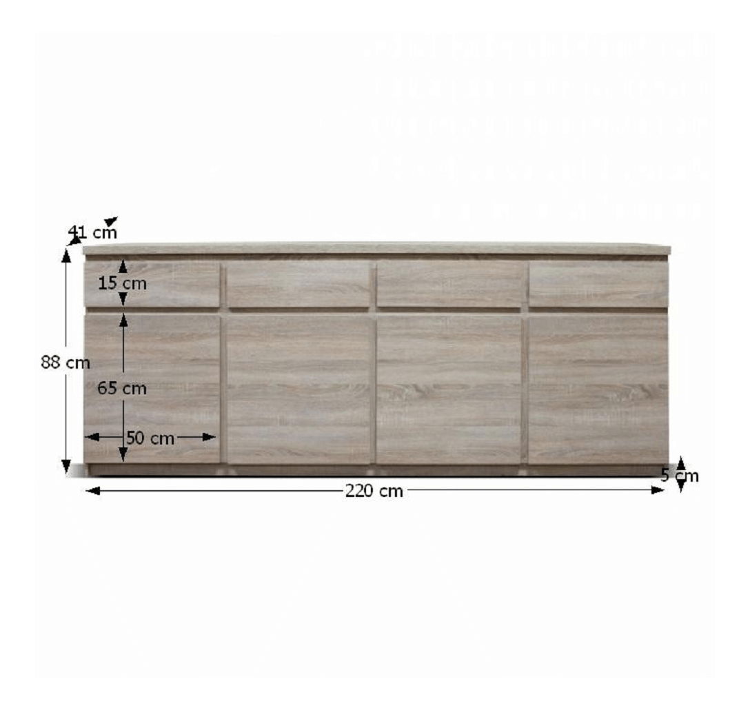 Komoda Punkto Typ 11 4D4S o výšce 88 cm a hloubce 41 cm je ideálním doplňkem pro váš obývací prostor. Tato 4dveřová komoda se 4 zásuvkami poskytuje dostatek úložného prostoru pro vaše věci. Komoda je součástí řady Panama, která přináší do vašeho domova stylový sektorový nábytek. Barevná kombinace dubu sonoma s moderním bezúchytovým otevíráním dodává místnosti pocit luxusu. Komoda je vyrobena z DTD laminovaného materiálu a každý díl je vybaven ABS hranami, což zaručuje dlouhou životnost nábytku. Rozměry ŠxHxV jsou 220x41x88 cm a tloušťka materiálu korpusu je 16 mm a vrchní desky je 25 mm. Komoda je dodávána v demontu, což umožňuje jednoduchou montáž.