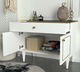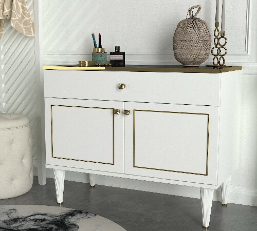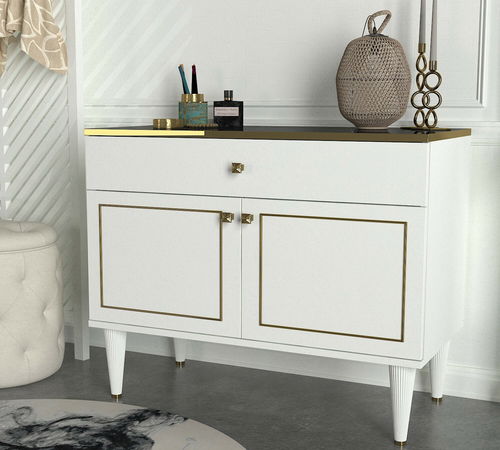 Komoda - Ravik výška 76 cm šířka 90 cm Bílá + Zlatočerná hloubka 44,8 cm Tato elegantní komoda - Ravik je ideálním doplňkem do vašeho domova. S výškou 76 cm a šířkou 90 cm poskytuje dostatek úložného prostoru pro vaše věci. Bílá + Zlatočerná barva přidává stylový dotek do vašeho interiéru. S hloubkou 44,8 cm je tato komoda dostatečně prostorově úsporná a zároveň dostatečně velká pro uspokojení vašich potřeb. Vyrobeně z kvalitních materiálů, tato komoda je odolná a dlouhotrvající. Je vybavena praktickými šuplíky a policemi, abyste mohli uspořádat své věci podle vašich preferencí. Bez ohledu na to, zda ji umístíte do ložnice, obývacího pokoje nebo chodby, tato komoda přinese do vašeho domova funkcionalitu a styl. Nechte se okouzlit jednoduchým a moderním designem této komody – Ravik a vytvořte si útulný a dobře zorganizovaný prostor ve svém domově.