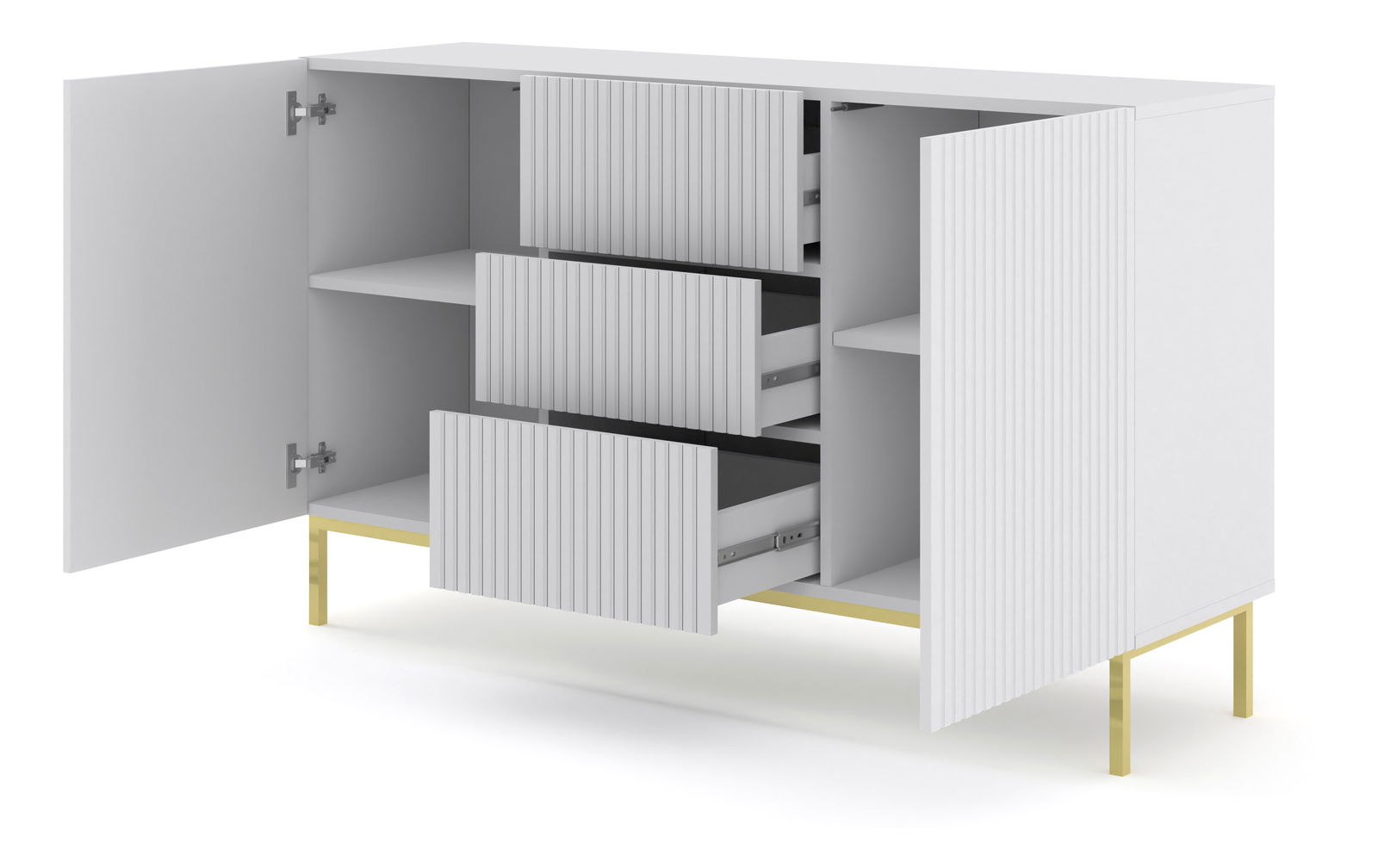 ZobrazitTV stolek/skříňka Rawy 2 (bílá + černá) o výšce 58 cm, šířce 150 cm a hloubce 42 cm je ideálním doplňkem do moderního interiéru. Tento nábytek z kolekce Rawy vyniká svojí elegancí a jedinečným vzhledem. Frézovaná čela v kombinaci s bílou a černou barvou dodávají do vašeho obývacího pokoje nebo jídelny stylový a výrazný prvek. Kovový rám podpírající tělo stolku zajišťuje jeho stabilitu. Tento TV stolek/skříňka je dokonalou volbou pro ty, kteří hledají jednoduchost tvarů, ale zároveň nechtějí ztratit na stylu a kvalitě.