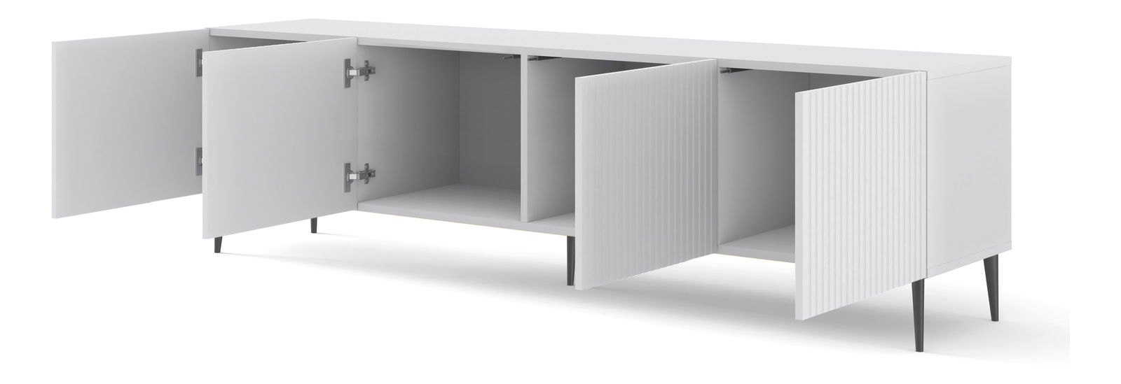 TV stolek/skříňka Rawy 4 (bílá + černá) o výšce 58 cm, šířce 200 cm a hloubce 42 cm je skvělým doplňkem pro moderní interiéry obývacího pokoje nebo jídelny. Jeho jedinečný vzhled a elegance dodají vašemu domovu osobitý šmrnc. Frézovaná čela v kombinaci s Kovovým rámem zaručují stabilitu, styl a výraznost. Tento nábytek je dokonalou volbou pro ty, kteří preferují jednoduchost tvarů a jsou zároveň fanoušky moderního designu. S TV stolkem/skříňkou Rawy 4 si můžete vychutnat své oblíbené filmy nebo seriály v pohodlí svého domova.