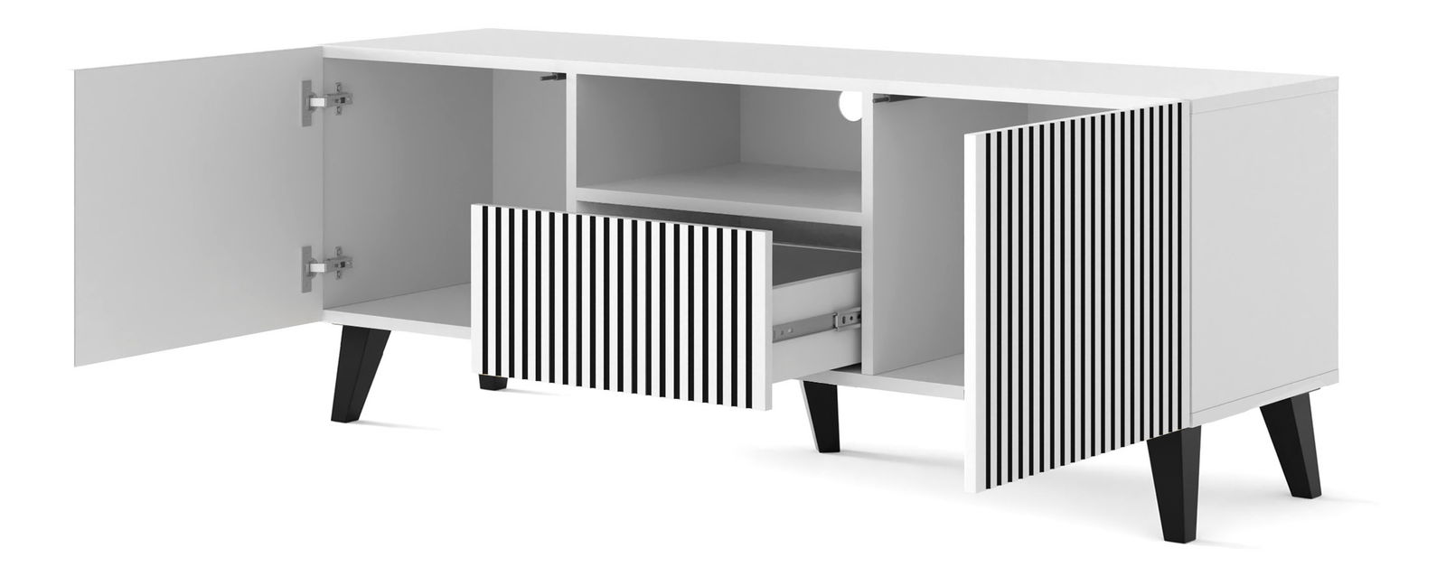 TV stolek Rawy (bílá) o výšce 56 cm, šířce 150 cm a hloubce 42 cm je elegantní kus nábytku ze sbírky, který dodává vašemu interiéru výjimečný vzhled. Jeho jednoduché formy dokonale ladí s frézovanými čely, čímž se hodí do moderních aranžmá obývacího pokoje nebo jídelny. Kovový rám poskytuje stabilitu a dodává stolku styl a výraznost. Vytvořte si jedinečný prostor díky stolku Rawy.