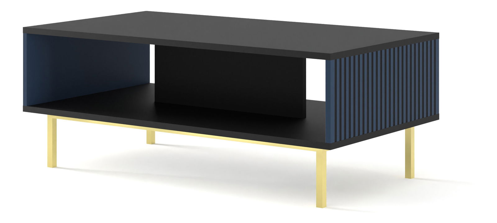 ZobrazitKonferenční stolek Rawy (černá + modrá) o výšce 43 cm, šířce 90 cm a hloubce 60 cm bude skvělým doplňkem moderně zařízeného obývacího pokoje nebo jídelny. Tento nábytek z kolekce vyniká svojí elegancí a unikátním designem. Jednoduchost tvarů dokonale ladí s frézovanými čely a Kovový rám podpírající tělo zajišťuje stabilitu a dodává stolu styl a výraznost. Konferenční stolek Rawy v černé a modré barvě bude vynikajícím místem pro setkání s přáteli nebo rodinnými oslavami.